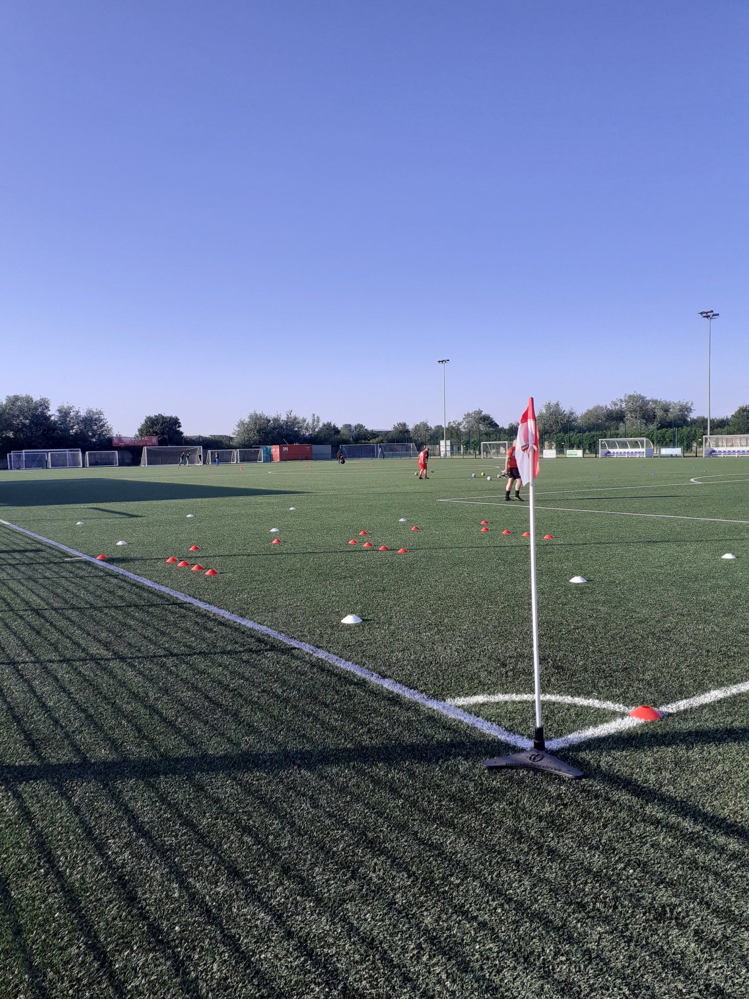 Before we even get into the ground proper a fellow Groundhopper greets us. He wants to know what team Maria’s shirt belongs to. It’s a Sassuolo 2016 kit and he heads off to google it. He pops up later, I still don’t know his name sadly. On making my way around the pitch I snap the above pictures of the training set up and the main stand. You may notice Tom Pratt in the corner there, sporting a Coventry shirt. I know Tom from the graps but he’s the tannoy man at Romulus. It was lovely to actually see someone and chat to them. It’s been a long, long time. As you can see from the pitch shot; it’s a 3G astro turf pitch. Given the heat, that’s probably for the best.