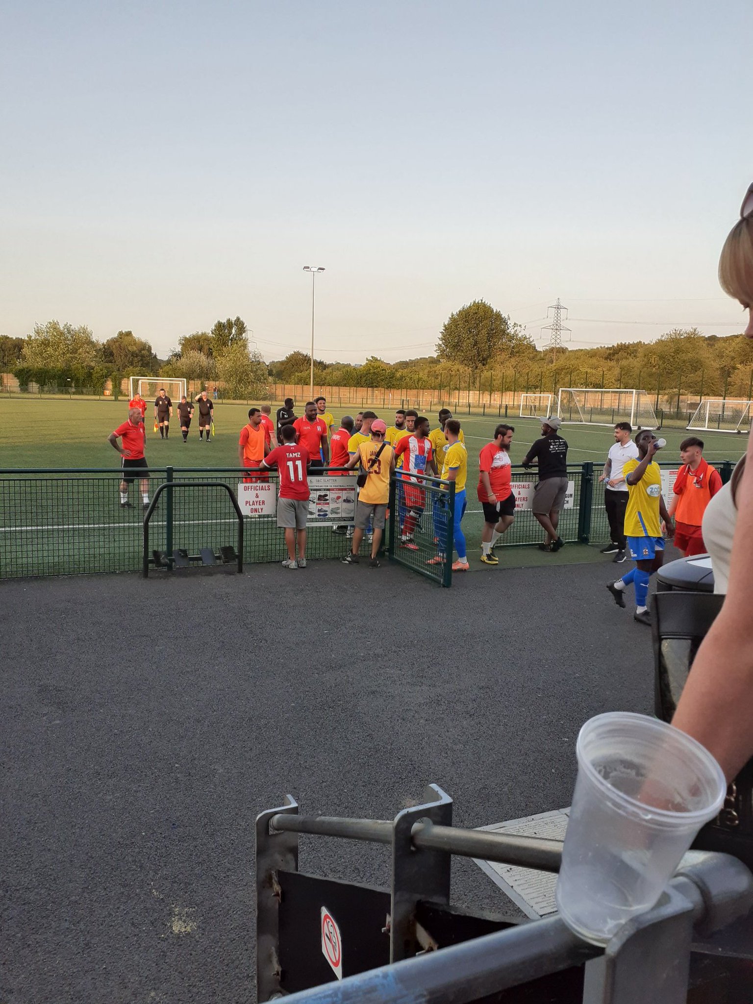 Maria discovers there’s a bar and brings me a pint of Carling. In this weather, I’ll take it! We go and sit in the front row of the stand. There’s around 80-100 people in. Presumably Monday isn’t as big a draw as Saturday when they had more for the visit of Bromsgrove Sporting.