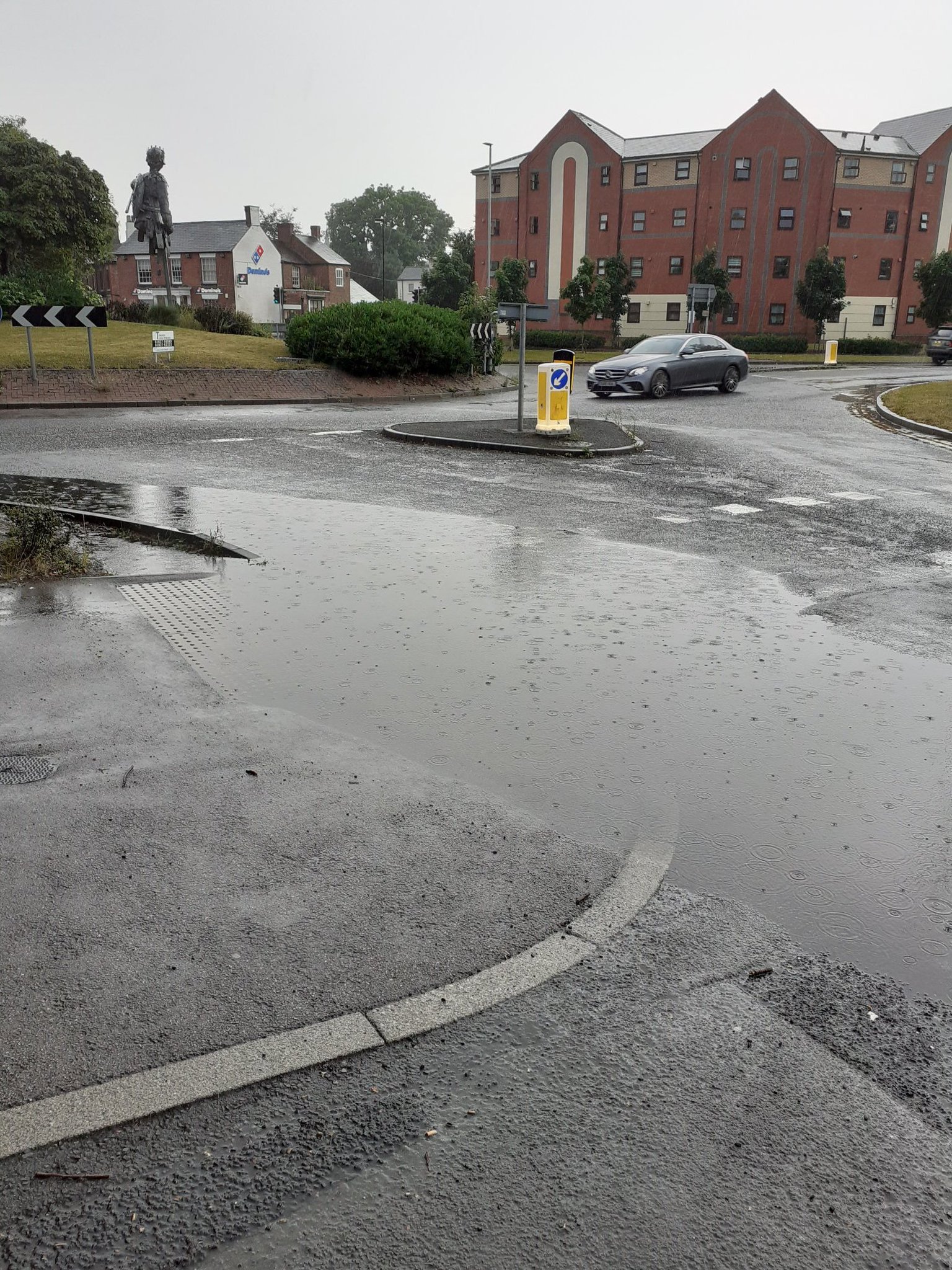The walk from the train station isn’t far. It’s under a mile. Before we started out we waited for the rain to die down a bit, which resulted in the hilarity of listening to this gobby little kid mouthing off to his dad. A literal real world Eric Cartman. He called his dad an “idiot”. It was priceless stuff. Glad we had the rain to keep us there for it. After the Lidl break we find our route to the ground is actually cut off due to flooding. We were due to cut through an underpass. Well, that’s flooded. So we cross the road by the island and…that’s flooded. It’s feet wet time. I manage to only get one wet sock thankfully.