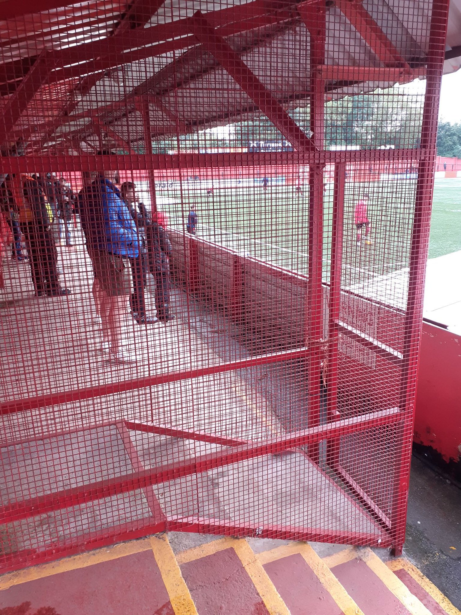 They’ve not upgraded their tannoy system and there’s only one tiny speaker away at one end. Next time they make the third round of the cup maybe they can buy a new one. My favourite feature is right next to where we stand; the red divider fencing between home fans and away scum, although on this occasion all the Halesowen fans stand at whatever end they’re attacking.