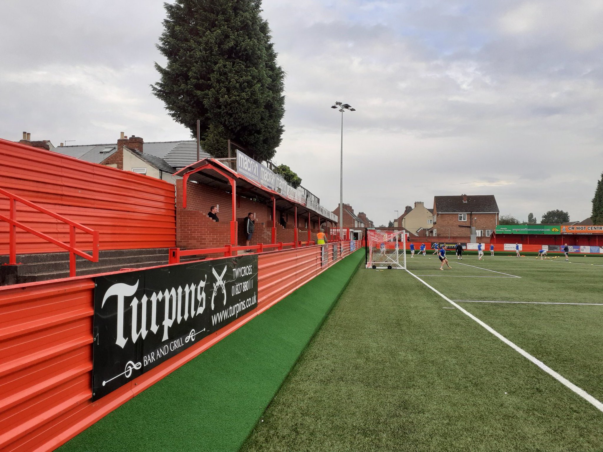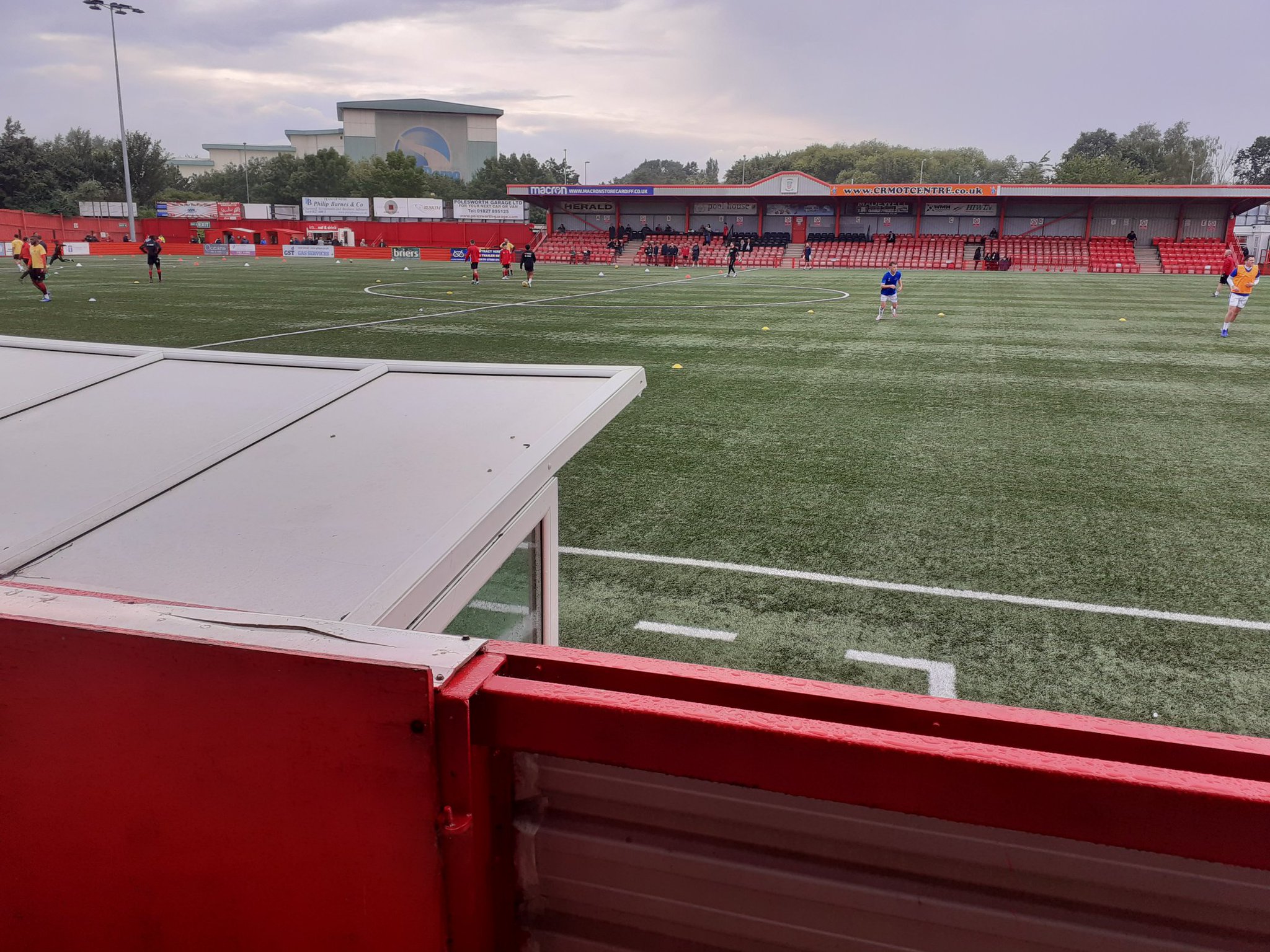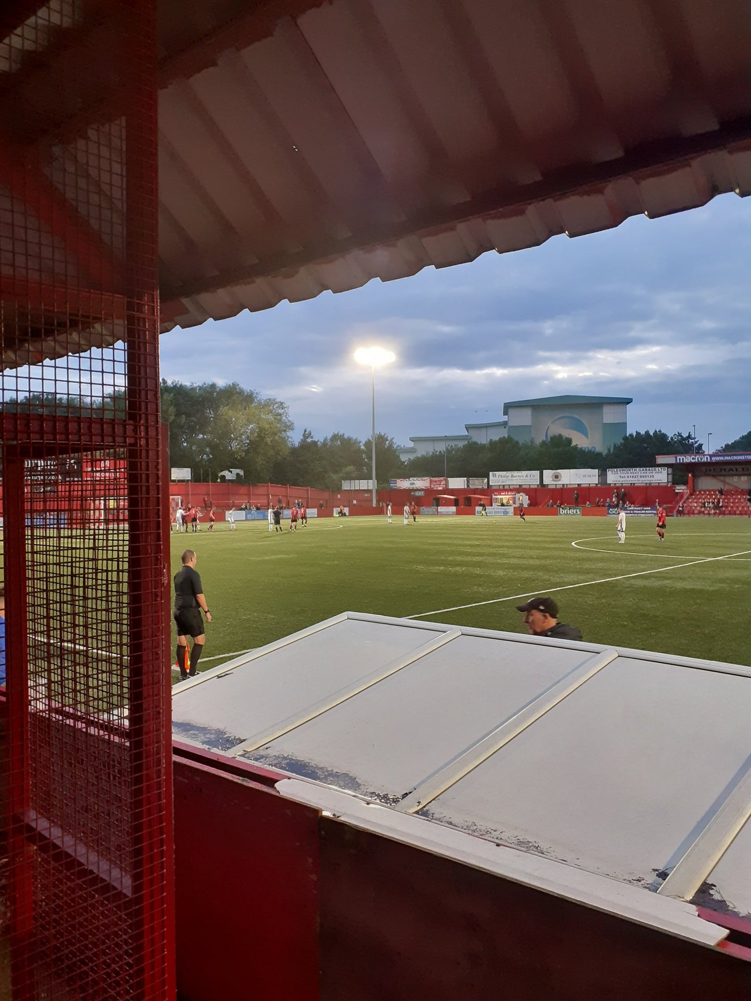 As soon as we get to the ground it stops raining. A football miracle. It’s a 3G pitch so they’ve probably just swept all the water off it. The rain was so bad at one point I thought the game might get cancelled. The poor weather hasn’t deterred the locals and there’s around 150 in the Lamb Ground to see this match. Tamworth is an interesting ground that’s been added to over time. So it’s a patchwork of different bits (painted red).