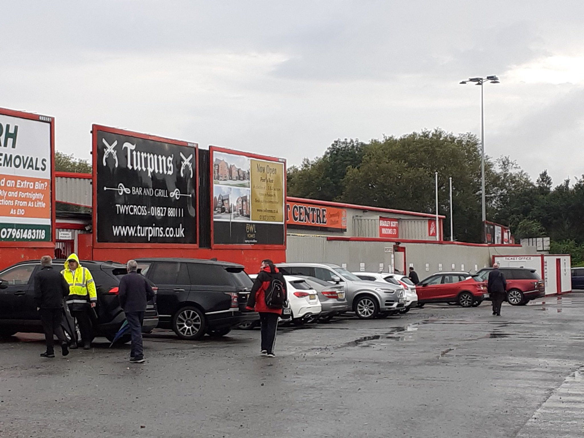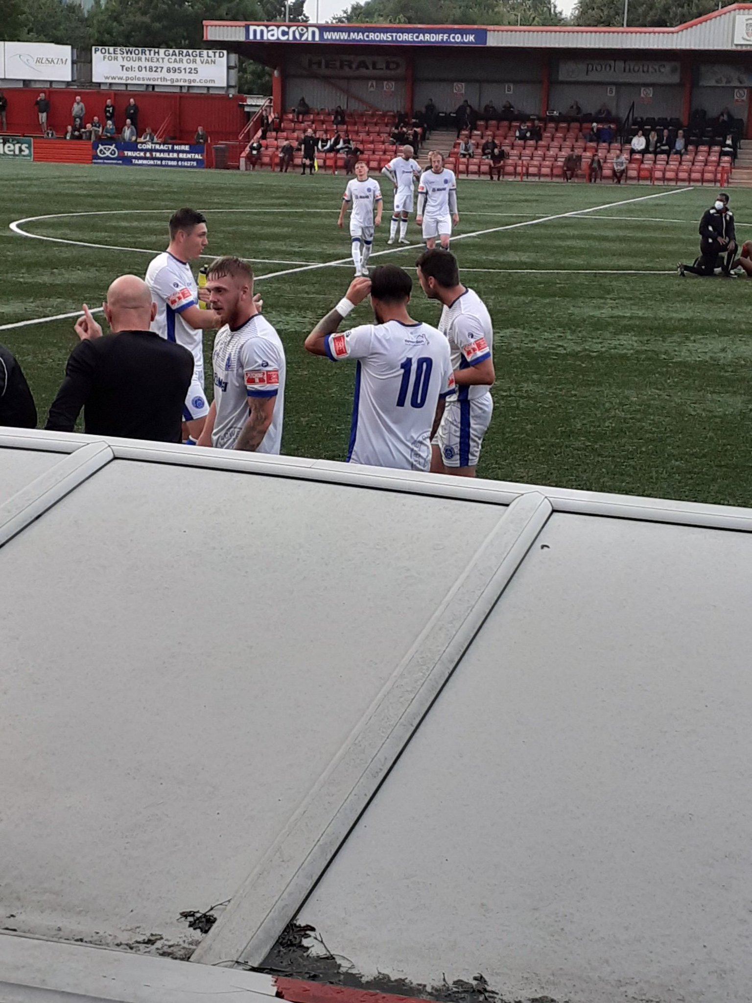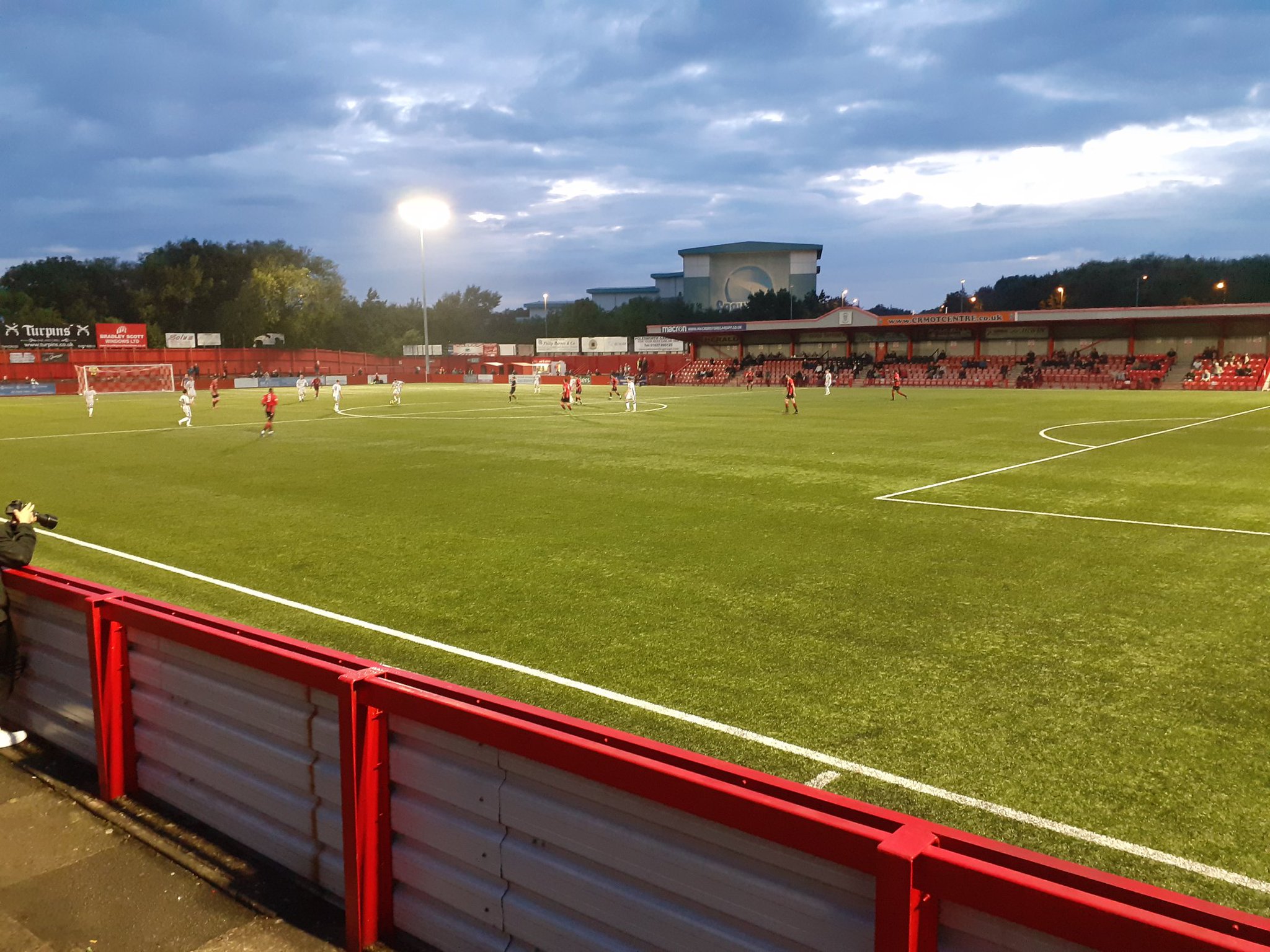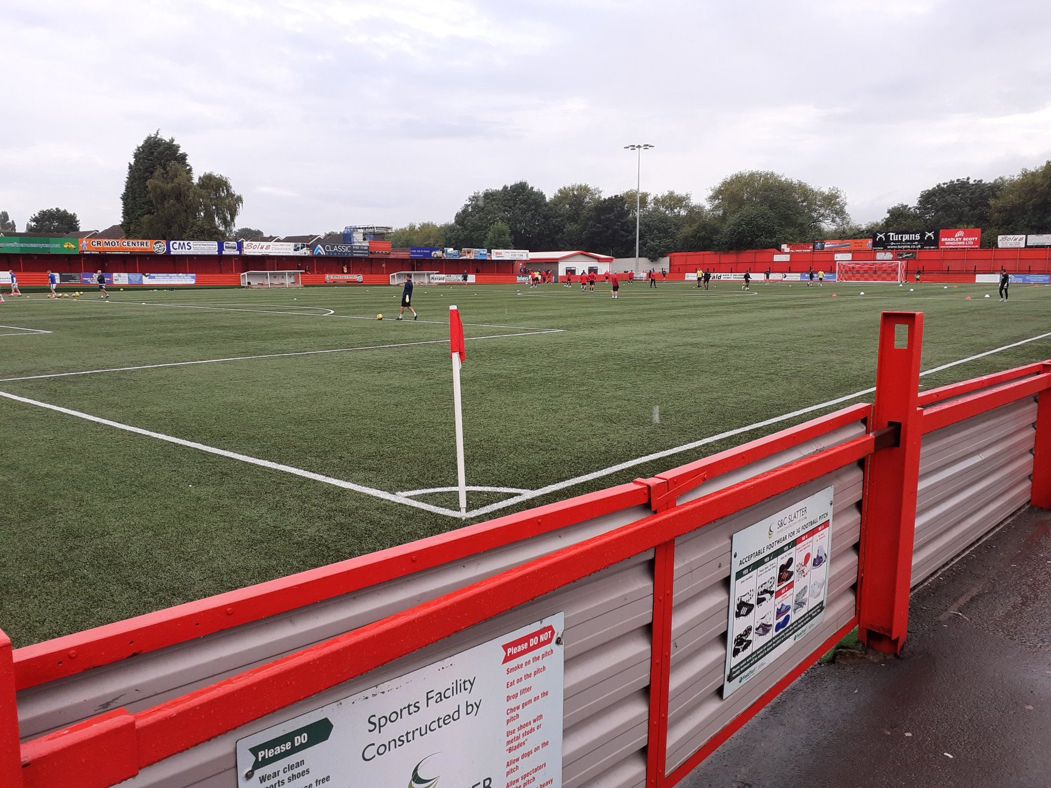 As soon as we get to the ground it stops raining. A football miracle. It’s a 3G pitch so they’ve probably just swept all the water off it. The rain was so bad at one point I thought the game might get cancelled. The poor weather hasn’t deterred the locals and there’s around 150 in the Lamb Ground to see this match. Tamworth is an interesting ground that’s been added to over time. So it’s a patchwork of different bits (painted red).
