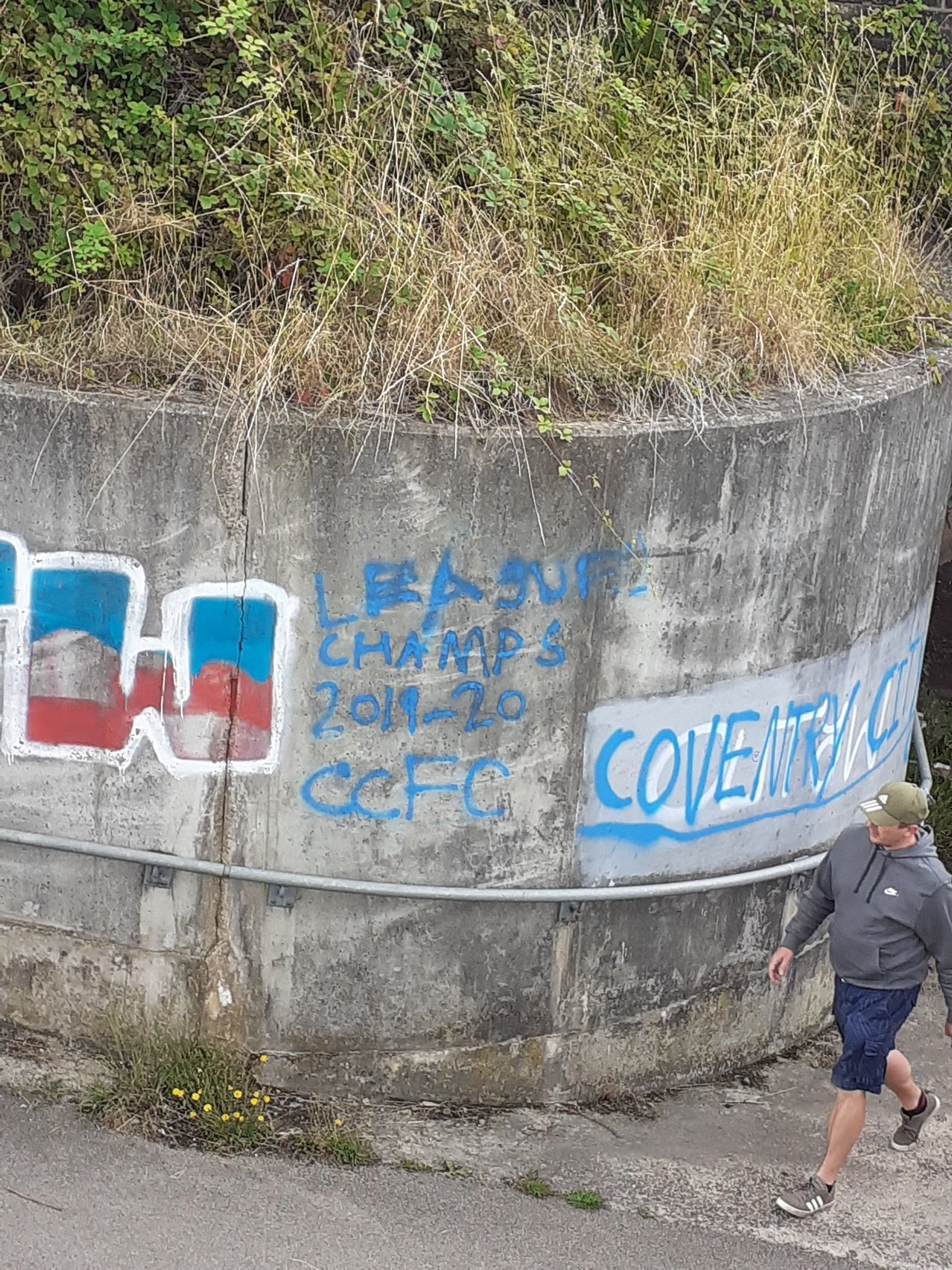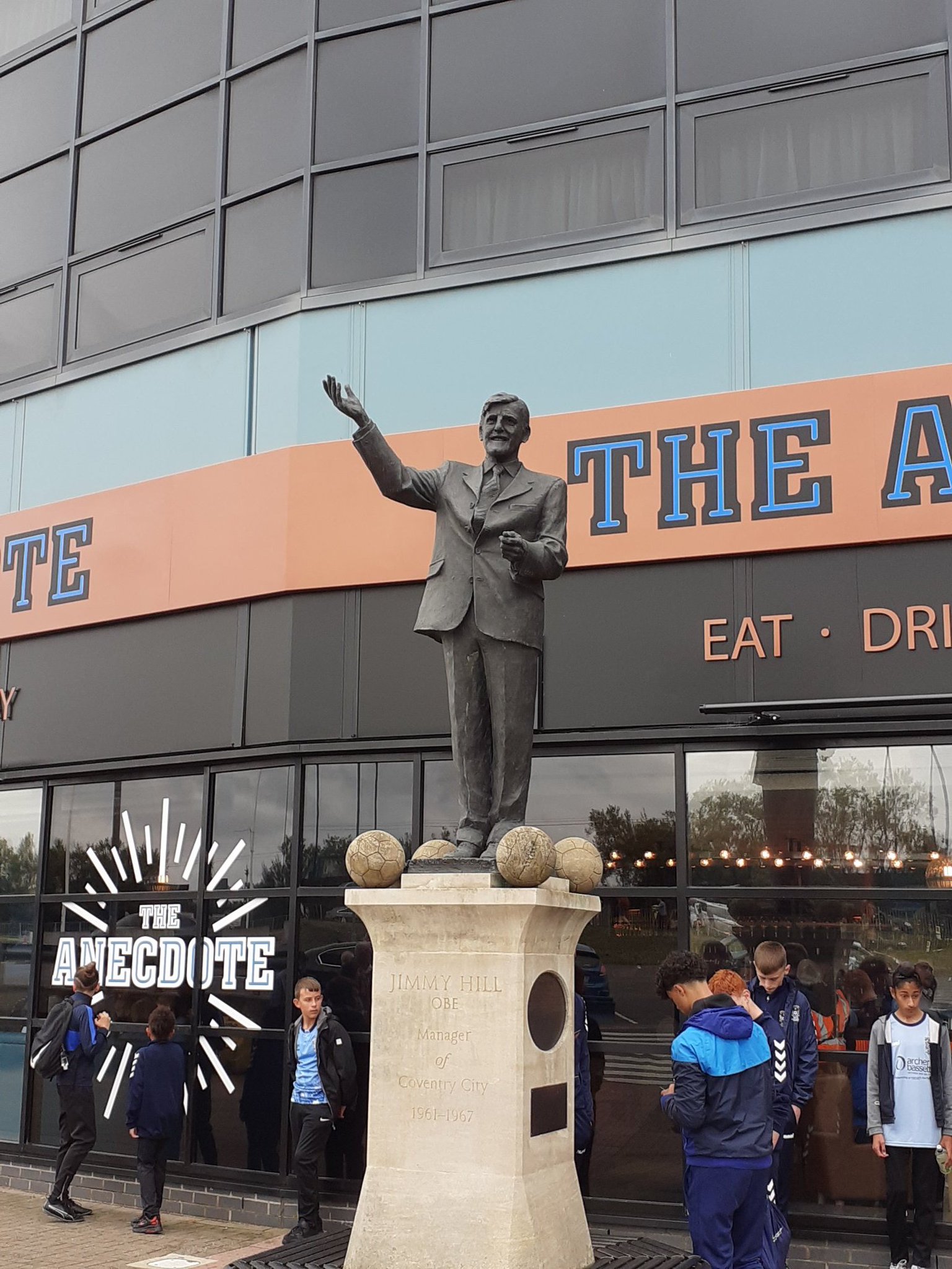 Tom meets us at Coventry station for the trip across Coventry. I was considering walking it but it’s three miles and Tom has a car so here we are. You’ll notice I don’t have much legroom. That’s because we were in a rush and the seat was that far forwards. I asked Tom where the adjuster was for it and he said front right. I fumbled around for ages and couldn’t find it so I just sat like that until the ground. I then discovered it was front left. Outside the ground we get to see some sensational graffiti. This is what football is about. Plus a statue of Jimmy Hill. I worry his chin may actually be anatomically correct.