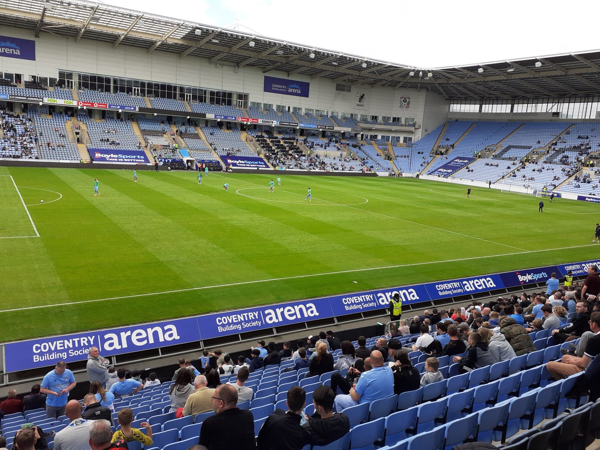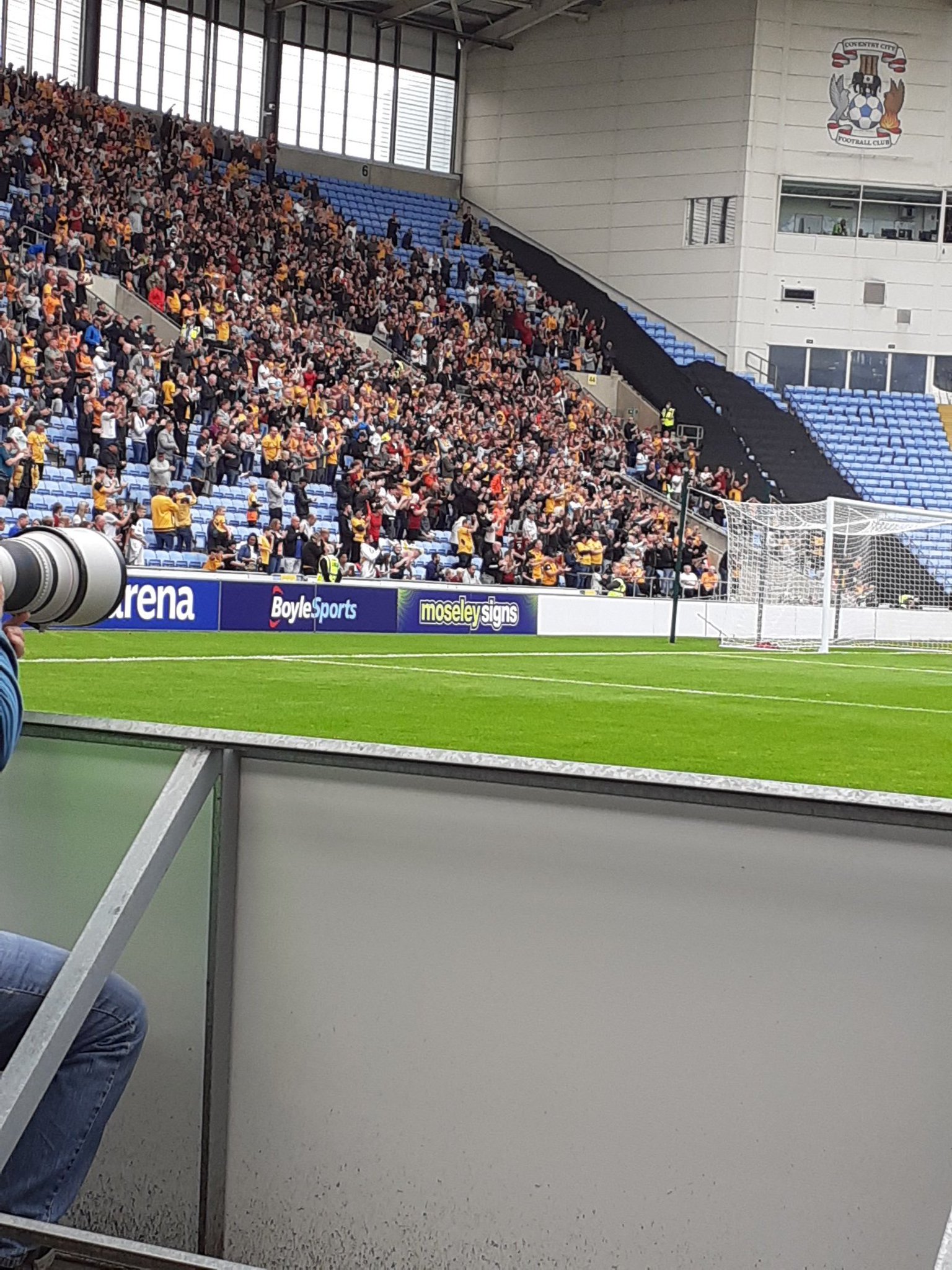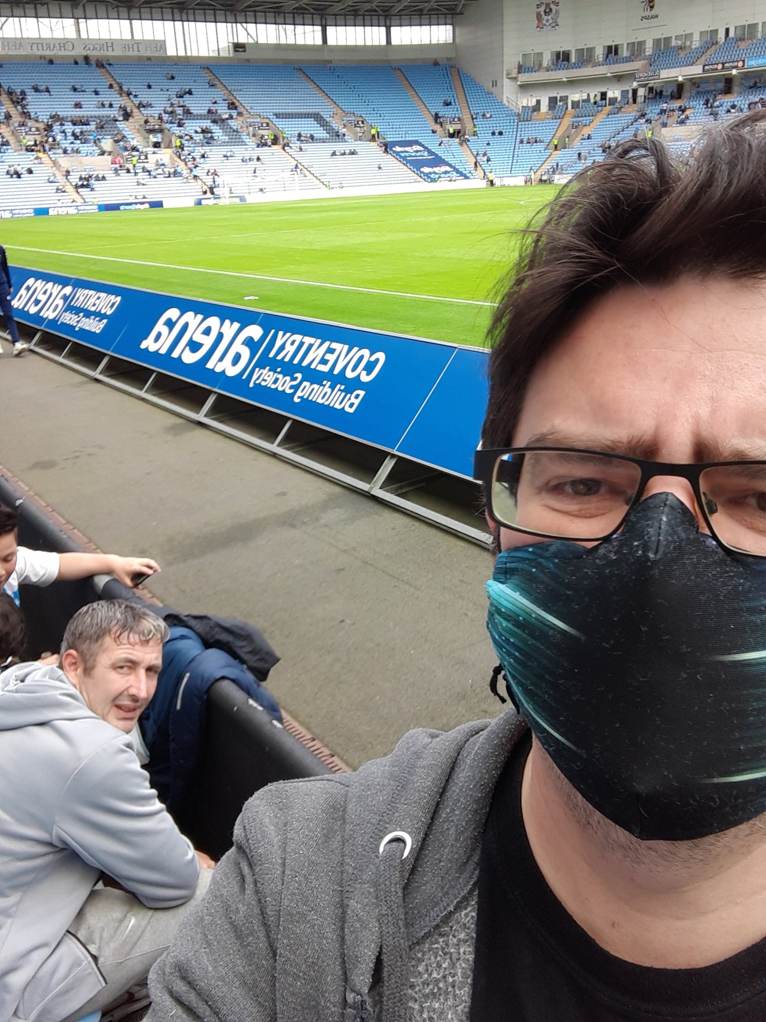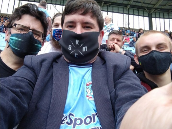 You can see most of his face/beard in the background here. I’m left, Tom centre, Josh right. The Ricoh Arena is a great ground. It’s a 32,609 seater stadium. It’s also home to the Coventry Wasps rugby union team. Which means when you access the Wi-Fi in the ground it asks if you want information about Wasps or their associated teams and there’s nothing about Coventry City. This is their first game back at the Ricoh Arena though, so we’ll cut them some slack. It feels like a historic occasion and the fans are in good voice.