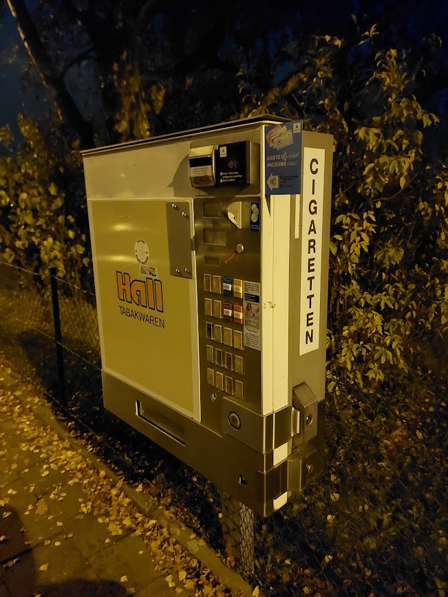 After making the smart play of parking on the road (the whole weekend was a triumph for road parking) we take a pleasant stroll to Buderich’s ground. Passing along the way, a cigarette vending machine. I’m told it needs your ID to work but why can’t a youngster just ‘borrow’ his dad’s ID and score some smokes?