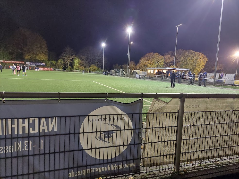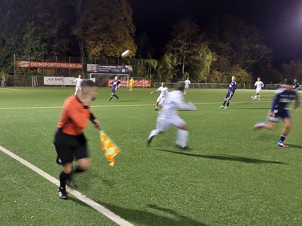 The game starts very fast with the visitors, Velbert in white, cooking. They spend the whole game running ruthlessly at the backline and it pays off for them. Yasin Kaya opens the scoring with a curling shot after breaking through the defence with a mazy run. 17’ played. 0-1. It looks like it’ll be a long night for Buderich after a belting shot from the edge of the box makes the corner of the net. Andri Buzolli. 20’ 0-2. The threatened deluge of goals never quite arrives, and Velbert miss chance after chance.