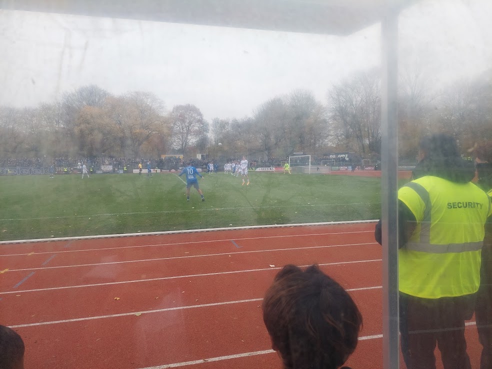 We end up settling for a spot behind the dugout, where I can (just about) see both goals. The whole place stinks of weed, so obviously that wasn’t part of the pat-down process. Marijuana is not a good sports crowd drug. You want to get amped up at football, not mellowed out. I suppose you can’t really break out the cocaine. Pot is now legal in Germany.