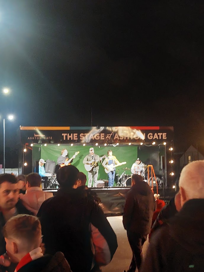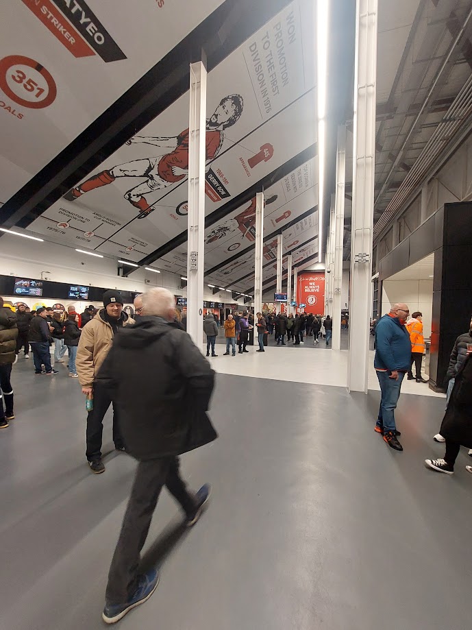 The outside does start to come into its own with the various stalls. There was a bunch of street food and a band, in dungarees, singing some country inspired twaddle. Sorry lads, that’s not my bag. We scan ourselves into the ground and suddenly Ashton Gate goes from “meh” to “holy shit”. Just look at this fucking concourse lads.