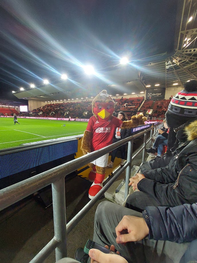 Due to our close promixity to the pitch I find myself slapping hands with the mascots, Red and Robyn. That’s a first. Let’s not dwell on why a bird has hands though. Bristol City attempt a pre-match light show. It’s absolutely shit and the fans, the ultras away in the corner to our right, loudly chant and boo through it. They’re not into it. At least the music is good to accompany it; AC/DC’s “Thunderstruck”. After that we hear Bristol City’s shit theme music. Mike is a huge fan of crappy football songs and is very into it.