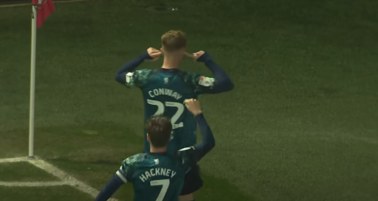 Not content with scoring against his former club he goes over to the ultra’s and celebrates in front of them by putting his fingers in his ears. The abuse gets much louder after that. Conway doesn’t help himself here. It’s clear he feels no concern for his former club. There’s an unwritten rule where if you score against your old club, you don’t celebrate. Tevez never celebrated against West Ham. Richarlison has never celebrated scoring against Everton. Conway? Wanker.