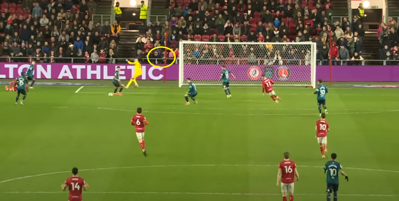 The second half sees more Bristol City domination in front of goal. I’ve circled our location on this replay. Mike’s red Dr Pepper hat making his location easier to pin down. City’s second half subs change the game. Winger Yu Hirakawa and midfielder George Earthy in particular. Yu makes a nuisance of himself down the right, Boro can’t clear and Earthy slots home in the middle. 72’. 1-1. Game on.