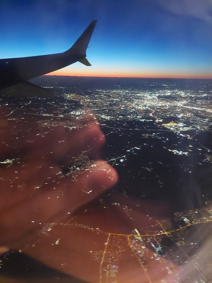 Once aboard we had screaming children in front and behind us, which was lovely. The one behind just randomly exploded. The one in front was a more consistent series of sobbing. Until the mother put the song “Baby Shark” on repeat. Great parenting mate. Let a tablet do the parenting while you fuck about. Marvellous. The good thing about a night flight, on a clear night, is seeing cities you know from the air.