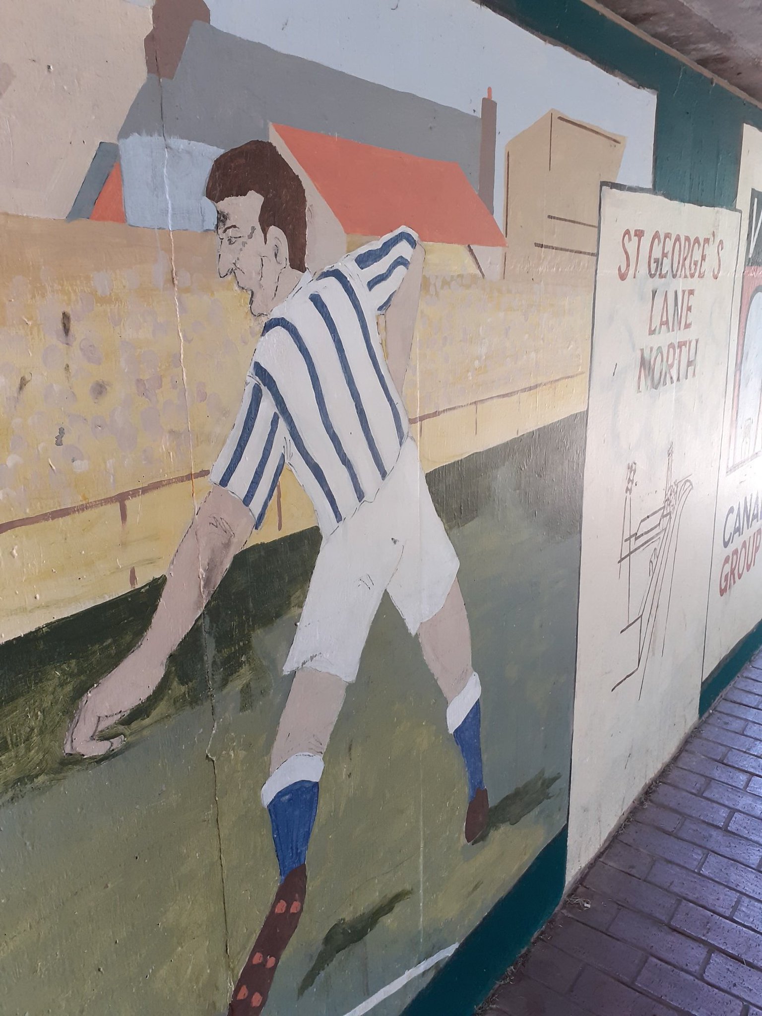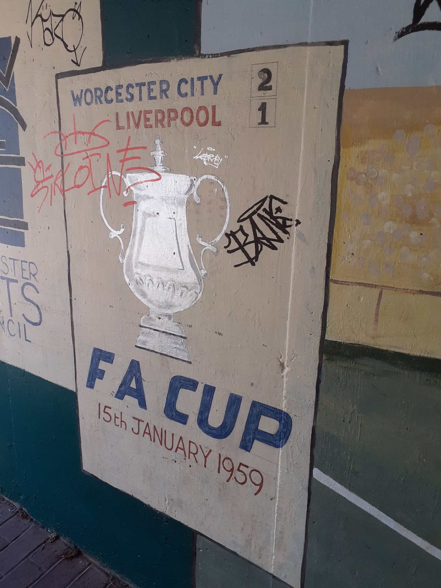 The previous ground, St George’s Lane, was along the canal. It’s still a beautiful location. I went down there to take myself a selfie by the condos that replaced the ground. There are still signs that a football team used to play there. The nearest tunnel under a canal has a mural on it depicting Worcester’s famous 1959 FA Cup victory over Liverpool (they beat Millwall the round before 5-2). Sadly some knobhead has decided to ‘tag’ it with his shitty graffiti. Worcester beat Liverpool in 1959. Some twat scrawled his name here in 2021. Levels to these achievements.