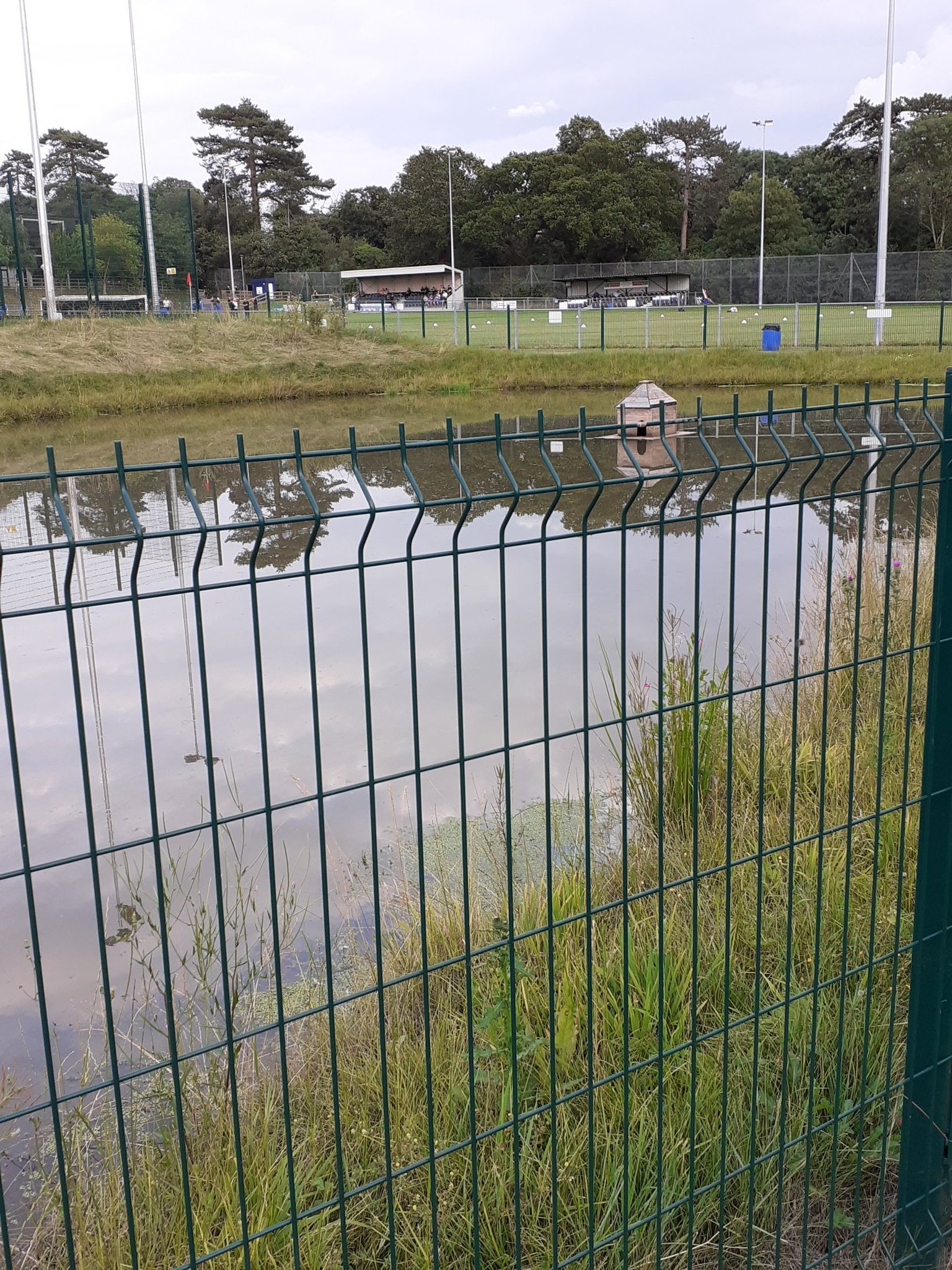 Another peculiarity is this massive, fenced off, pond right by the entrance to the ground. It’s definitely in reach of the pitch if someone punts a clearance that way. We didn’t get to see a splashdown this evening but we did get to see a clearance land in the 3G pitch, which is alongside the pond.