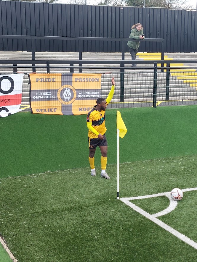 Here’s one for Rushall’s club website. A marvellous photo of Omari Sterling-James (FACKIN’ TWO NAMES) about to take a corner. Unfortunately, the corner missed everyone and went out for a goal kick. Resulting in Sterling-James screaming “that’s fucking shit” to the heavens. Someone behind the goal agrees with him.
