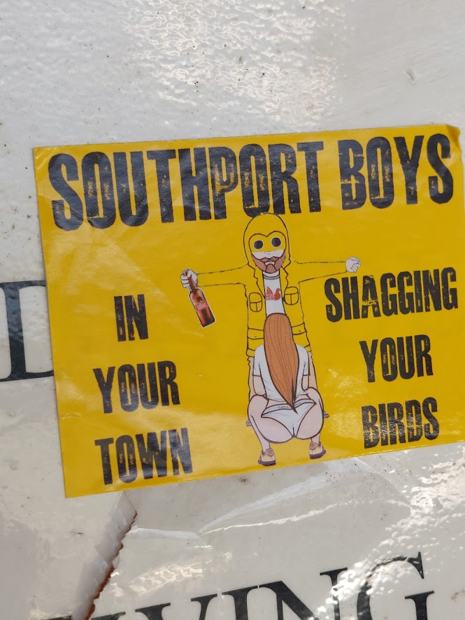 We move back into the shed area to watch the second half, and I was delighted to see this tasteful sticker from one of the Southport lads. They’ve got a better shot at a pork pie and a pint at the local than a blowjob though. I find it hard to believe they’d hang around in Rushall after the game, and Birmingham city centre feels far more inviting. Anyway, I’m probably thinking way too much about the sticker, let’s get on with the game.