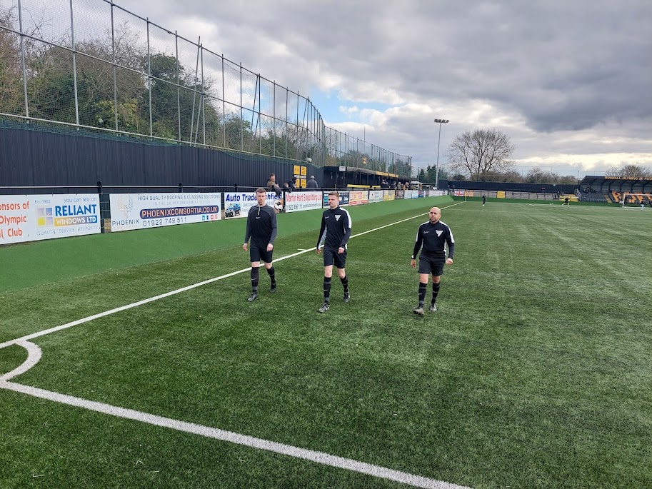 I went to take a picture of the side of the pitch and captured the referee crew doing their warm ups. Mr Gupta, who’ll be running the line, asked if I’d got a good shot. I did! There’s a stand, of sorts, down this touchline. A shed that allows two tier standing. It’s the only real feature down that side of the pitch.