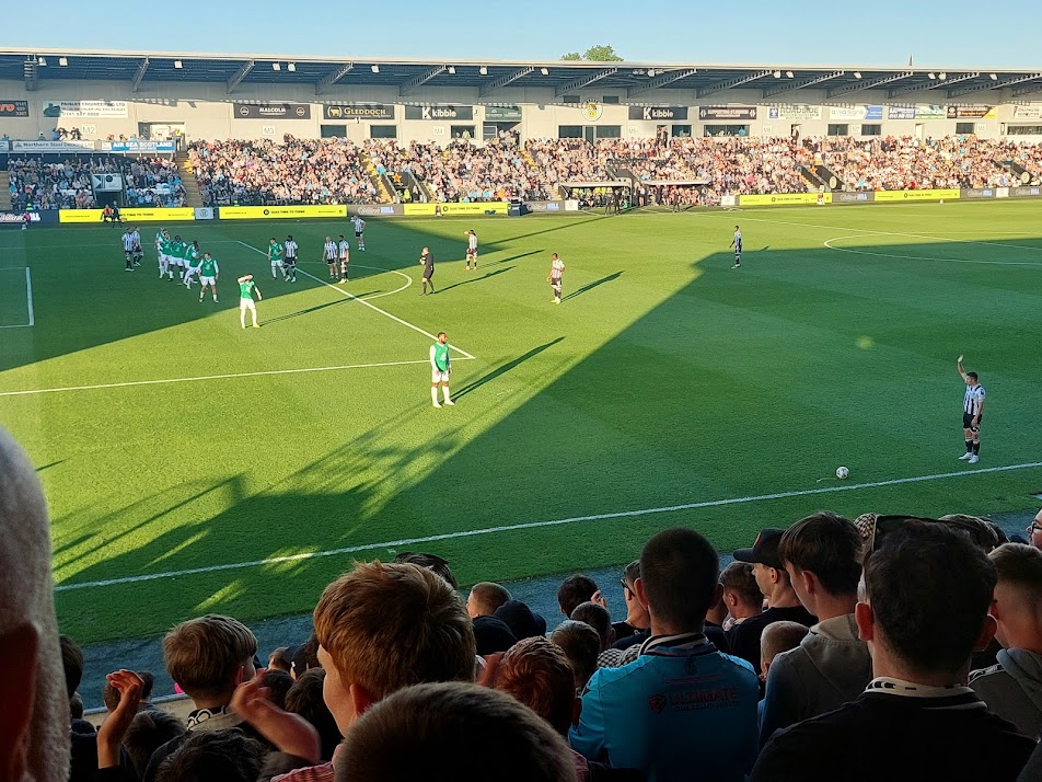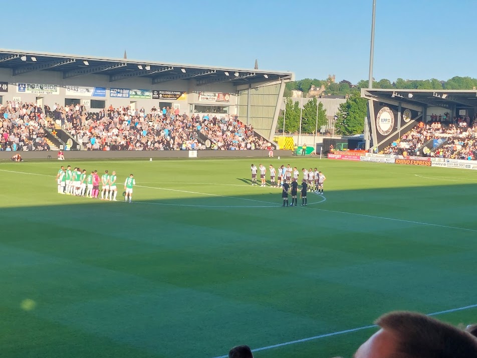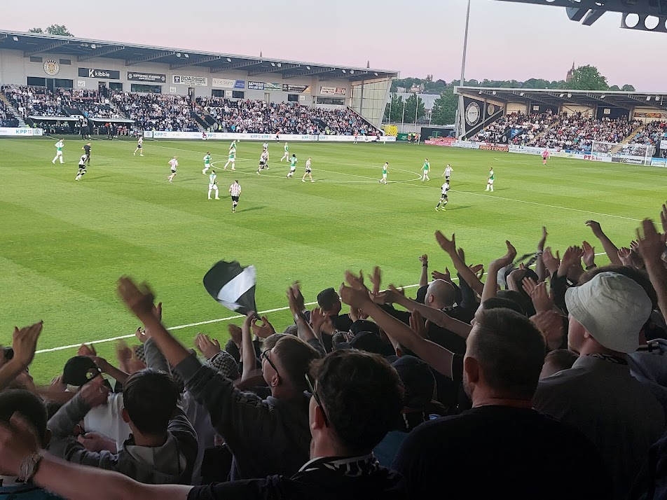 Eager to score one more ground before the season ended, and finally free from parental care duties after my father has recovered from his run of poor health, we’re in Scotland. Maria and I have been married for 16 years and chose to celebrate this year by travelling to Scotland, picking up Eddie Sideburns, and driving into the beating heart of Paisley. St Mirren Football Club. Thanks to Eddie, we had no issues locating street parking. It’s a busy club and the ground was rammed for an end of the season showdown. St Mirren’s final home game of the season. Hibs needing merely a point to secure European football next season.