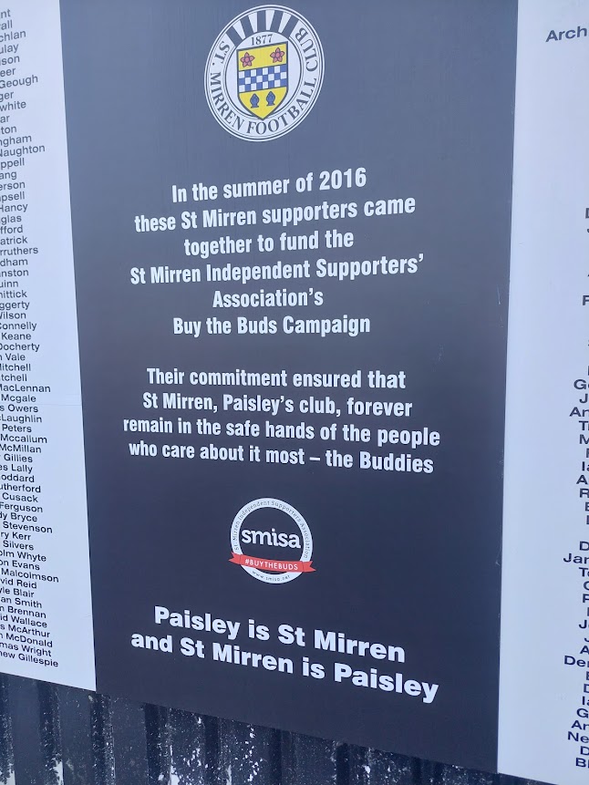 Initially I rather baulked at the current name of St Mirren Park the “SMiSA Stadium”. That was until I found out what SMiSA stood for. It’s the supporters themselves. To avoid the horrors of corporate naming deals, they’ve sponsored the stadium. Fair fucking play lads. I respect the shit out of that. There is further evidence of St Mirren eschewing the recent Scottish tradition of flogging the club to a rich foreign owner.