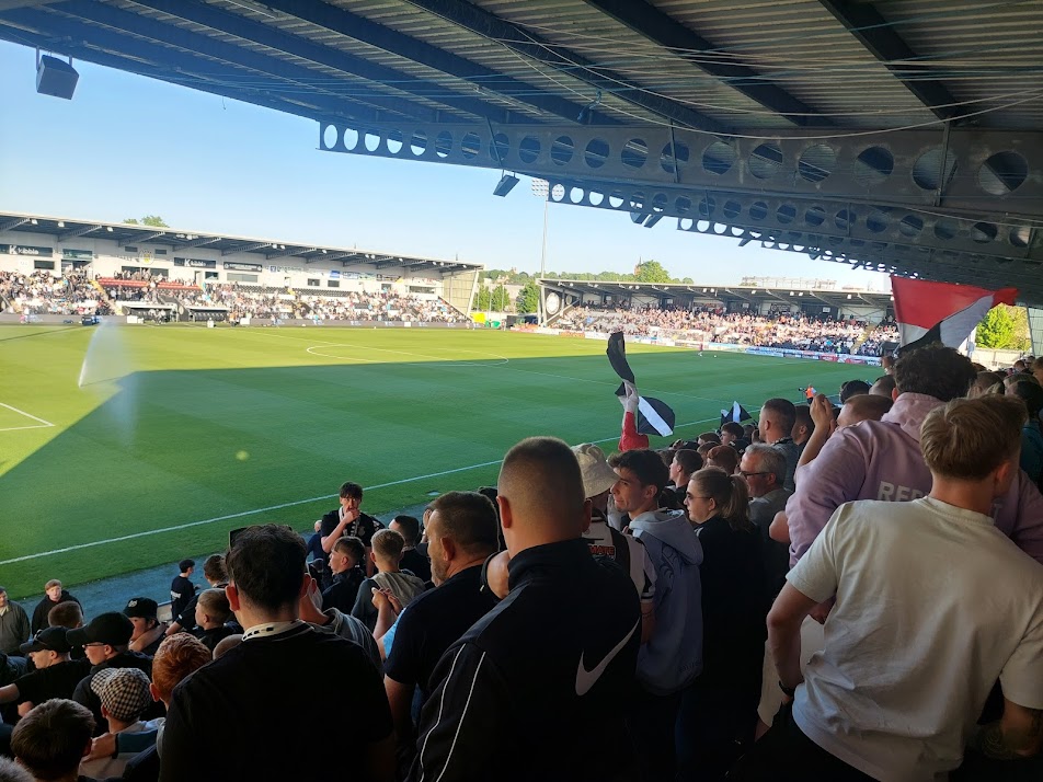 From the outside St Mirren Park looks like a tidy affair. The lower brick/upper steel siding approach is reminiscent of Millwall and Mansfield. The stadium was opened in 2009, the same year we got married. It’s appropriate both have lasted and thrived and are still having a nice time 16 years later. As we chat about tonight’s game Eddie informs me, I have purchased tickets in with the Ultras. On the seating plan, it looked like the away end was at the other end of the pitch. It’s not. We’re right by it.