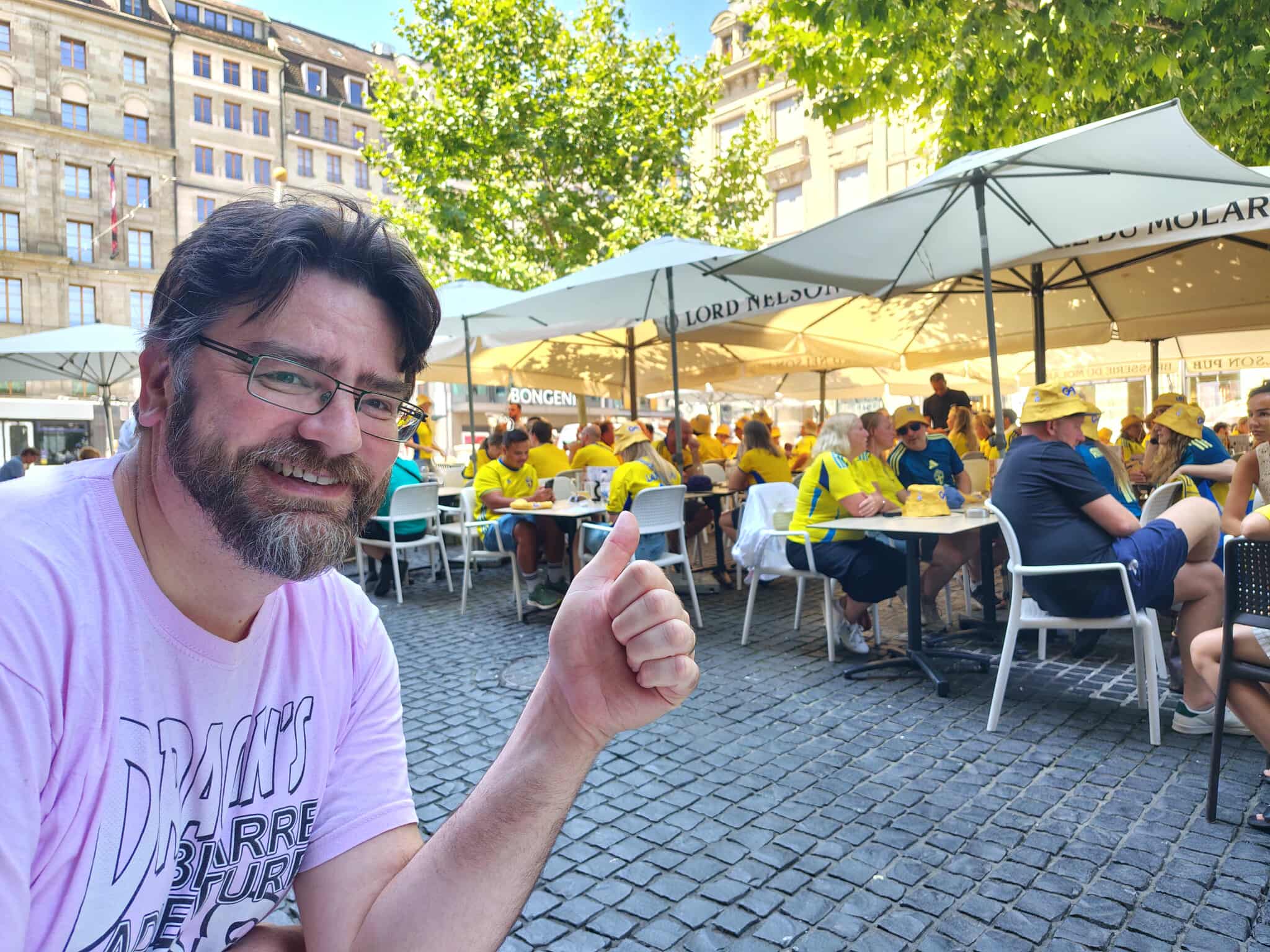 When it comes to old European cities, I can just walk around them forever. Explore alleyways and rooftops to my heart’s content. Luckily, “wandering around” is a hobby of Mike’s so we get along very well on these trips. We stop off for a beer, due to thirst, and end up taking shelter from a storm. The pub is called Bierliebe & Friends. The lady who’s working is on her own. Watching her command performance is wonderful. At one point she’s chatting away, switching effortlessly between four-five languages, and she put her hand on my shoulder and asked if I wanted another beer. Sensational service. If I was starting a business, anywhere, she would be a great hire. She must have been knackered by the end of the day. Her boss left her all alone with a town full of thirsty Swedes. Camp Sweden was right next door!