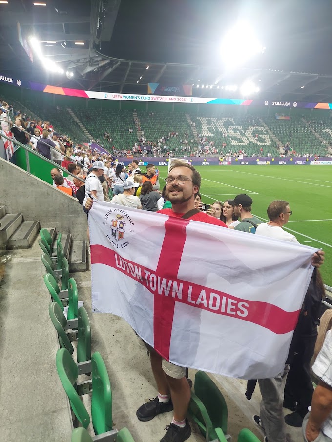 After a couple of pre-match beverages and a bratwurst, we are at the ground. Mike heads in early to put up his flag. He’s got a Luton Town Ladies England flag.