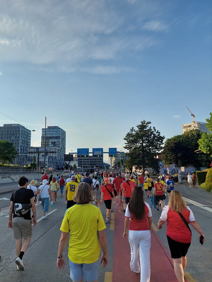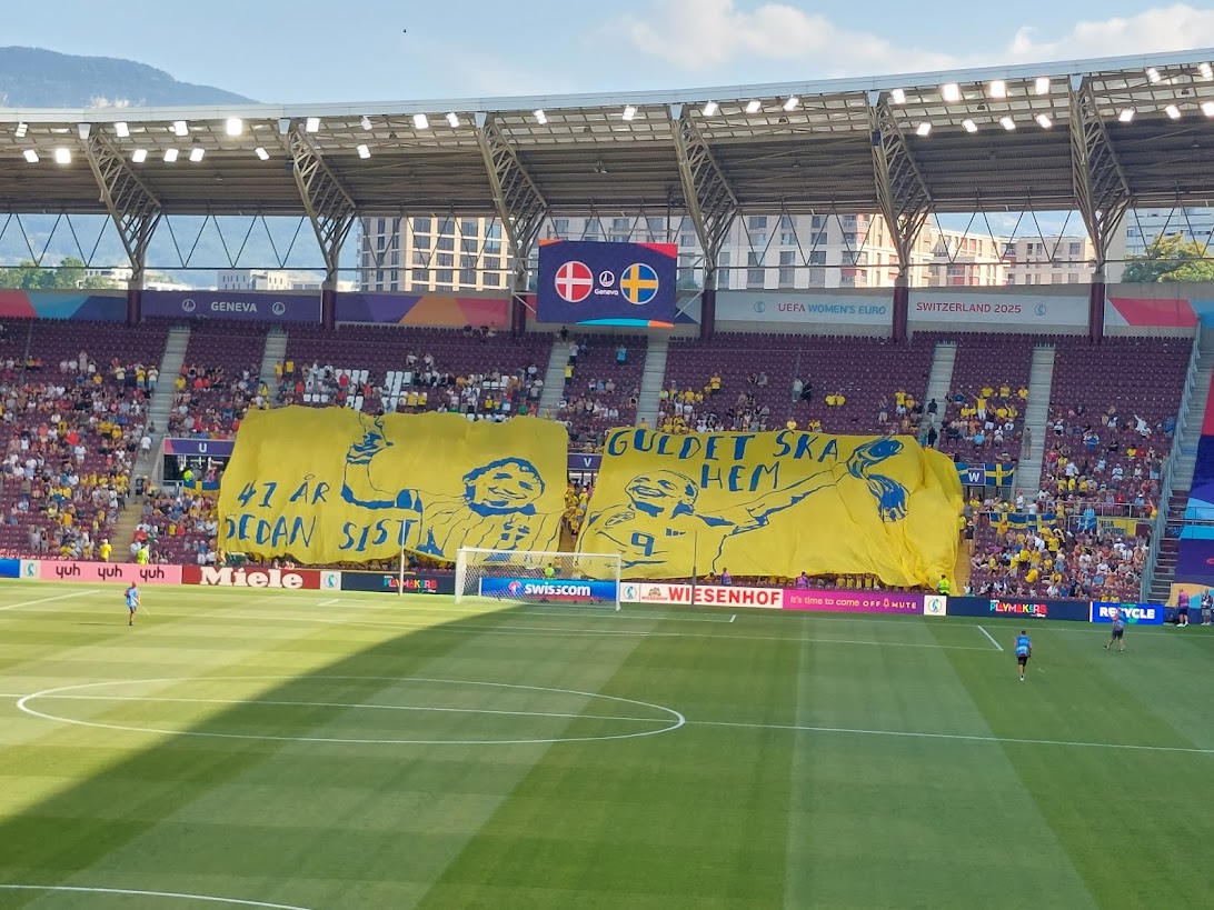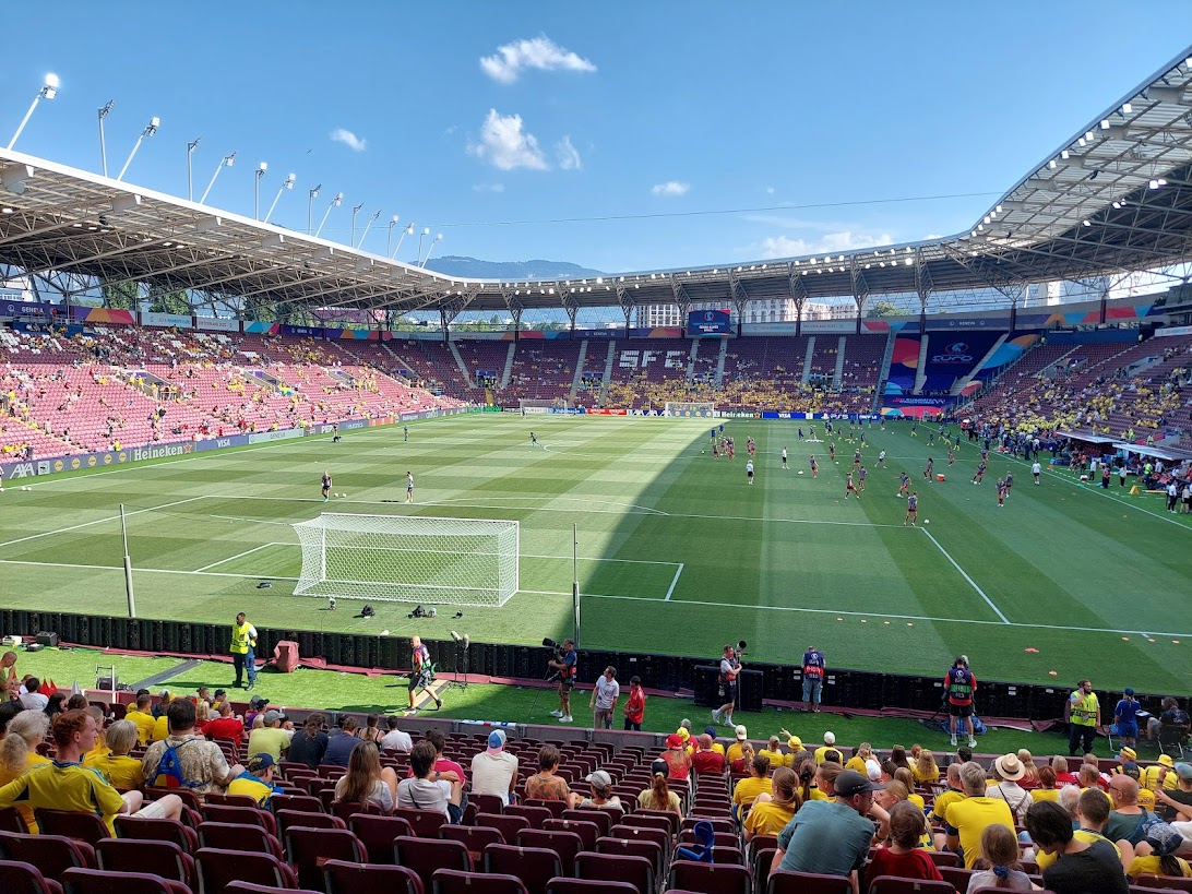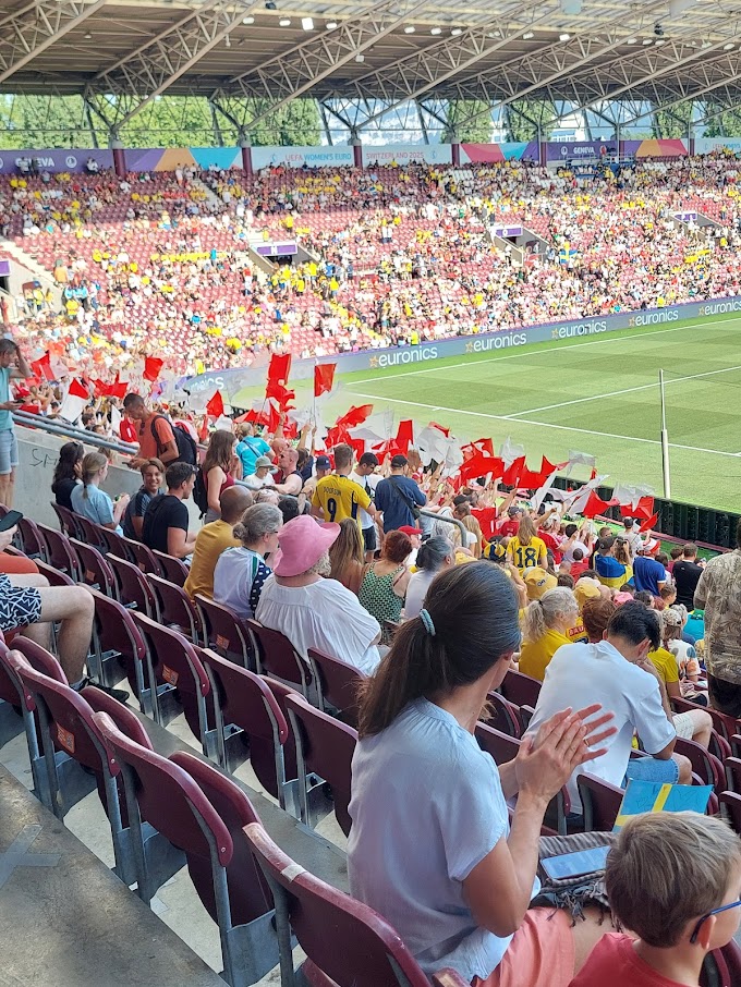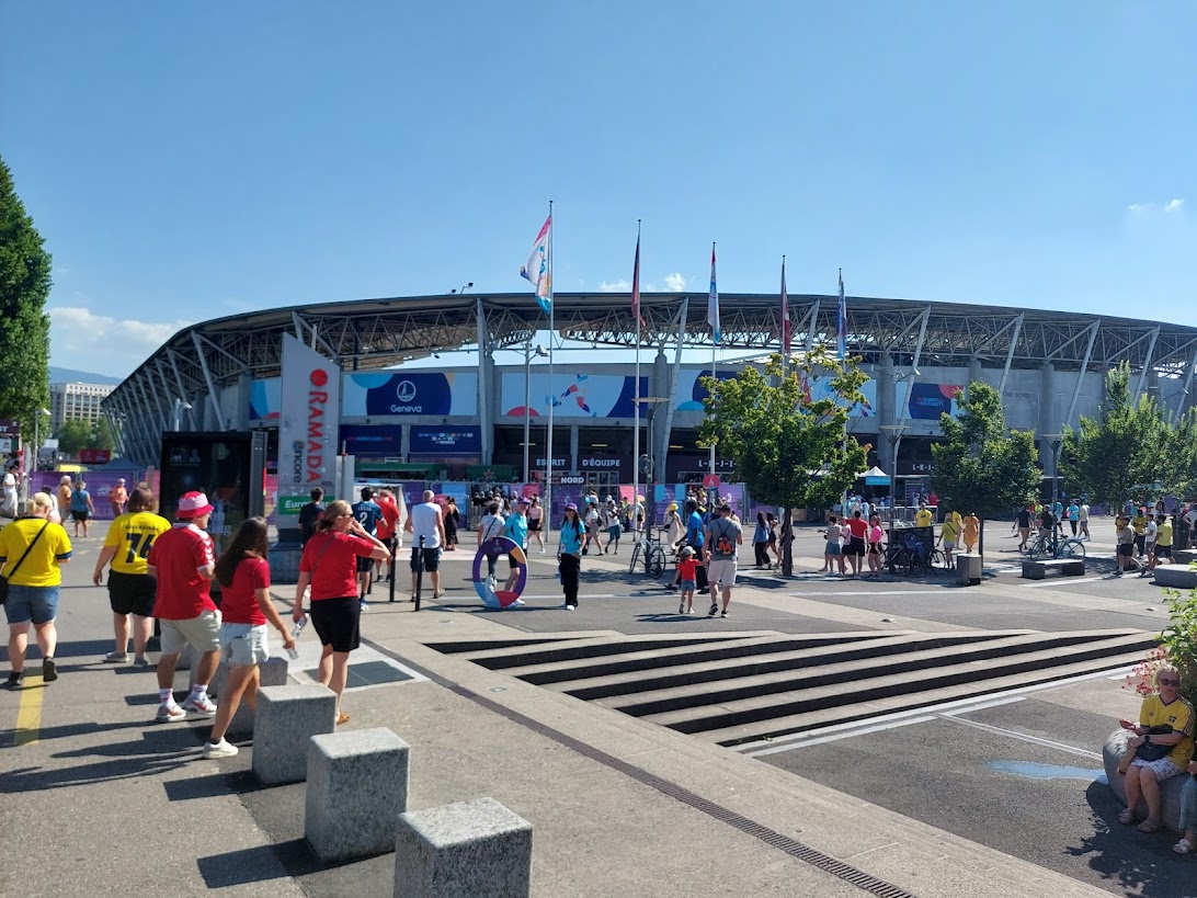This is our first stadium. The “Stade de Geneve”, home to Servette. We’re directed to the ground by enthusiastic volunteers with foam fingers. As if none of us have Maps. They’re blaring ABBA on a portable speaker, which stinks of favouritism and Denmark should, rightfully, be fuming. Although they are heavily outnumbered here. Sweden took NUMBERS to this tournament.