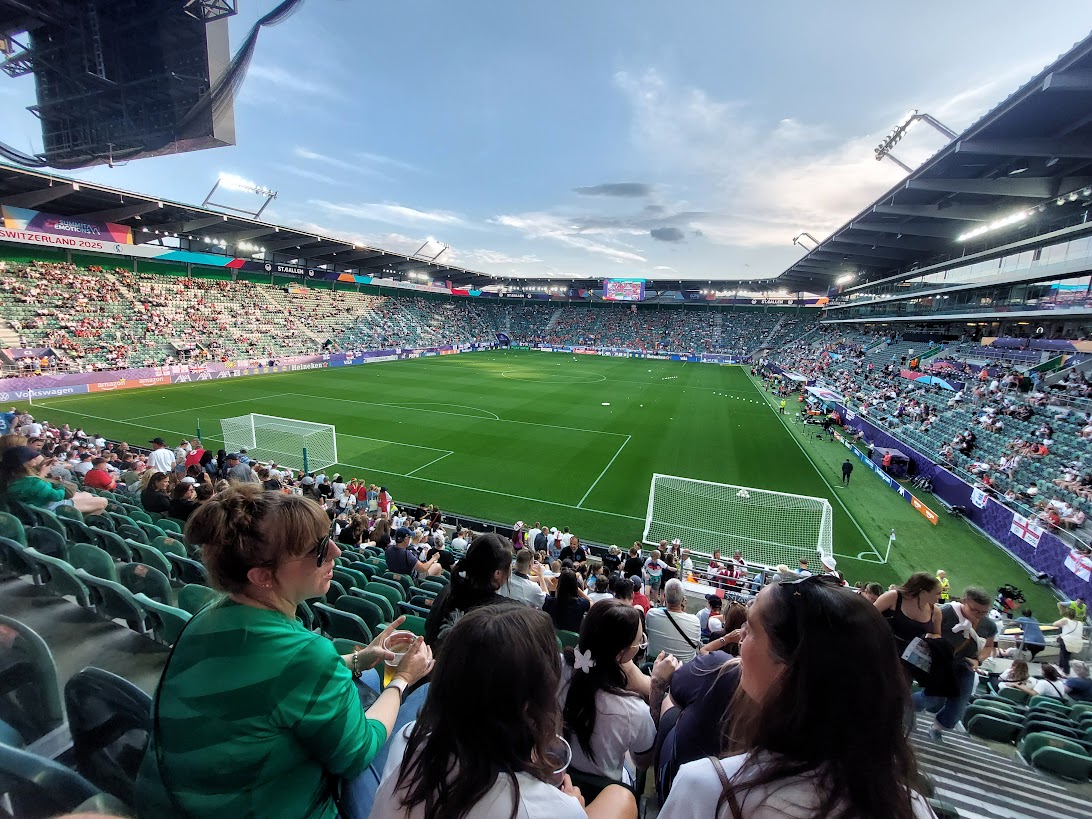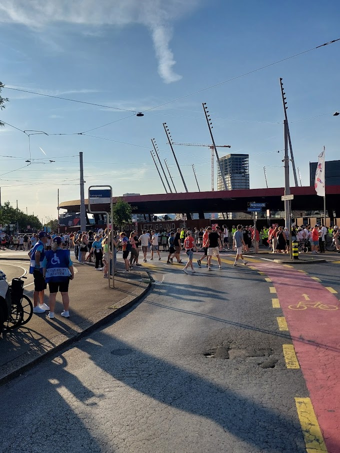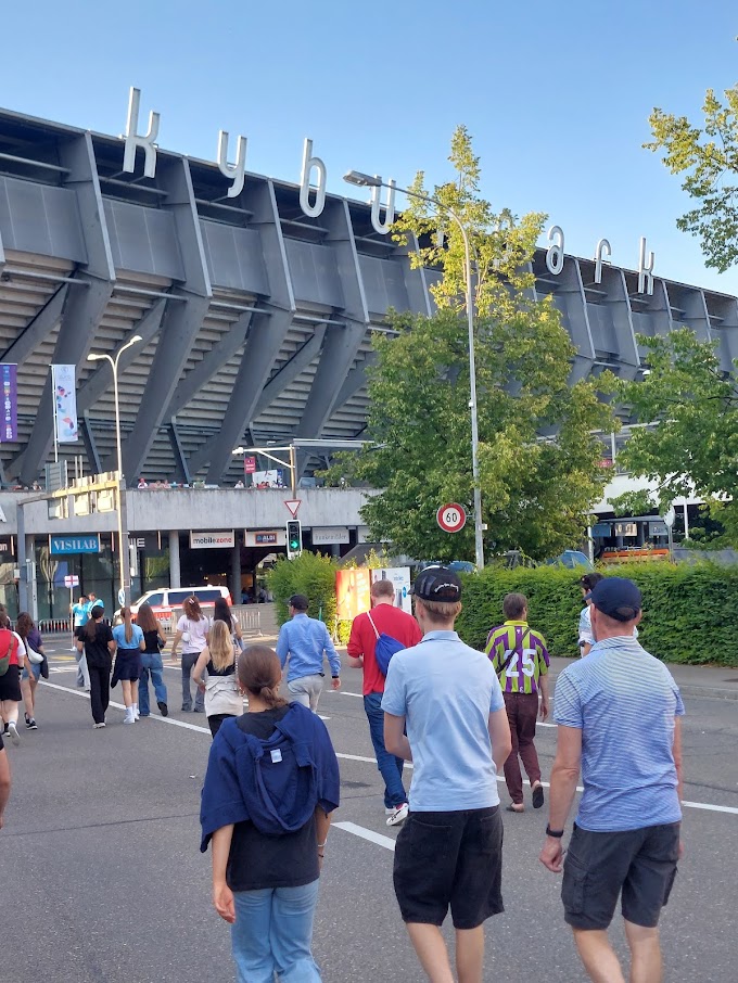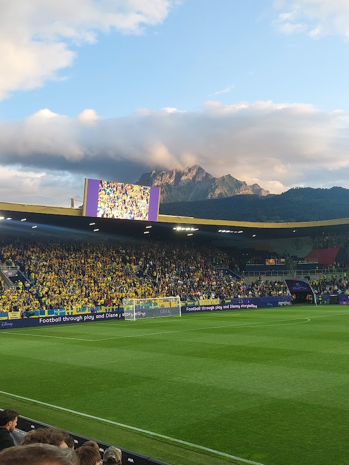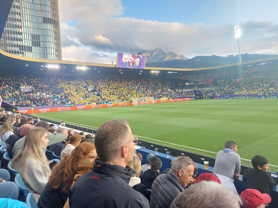 This is our first stadium. The “Stade de Geneve”, home to Servette. We’re directed to the ground by enthusiastic volunteers with foam fingers. As if none of us have Maps. They’re blaring ABBA on a portable speaker, which stinks of favouritism and Denmark should, rightfully, be fuming. Although they are heavily outnumbered here. Sweden took NUMBERS to this tournament.