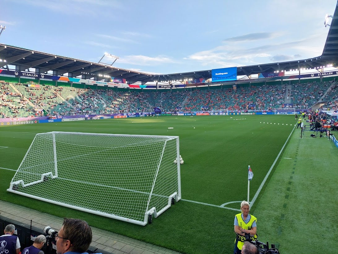 We meet Mike’s friend Harvey and his friend Callum. Both of whom are over to watch the knockout stages. I am mad jealous. I have them both on Futbology and when they checked in for Italy vs. Norway, I got those pangs of jealous again. We have to get a bus to the ground here because walking it is off the table. It’s fucking miles away. It’s the worst stadium location of the trip. It’s legitimately 90 minutes walk from central St Gallen.