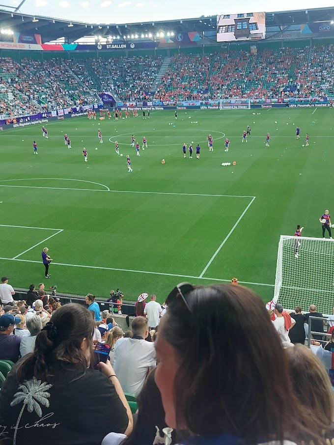 Security is intense. We get funnelled into lines and patted down. There are bag checks, bottle caps are removed, and the cops have GUNS. The security is on a par with men’s tournaments. I assume UEFA has a baseline standard and we’re sticking to it, but the atmosphere feels friendly.
