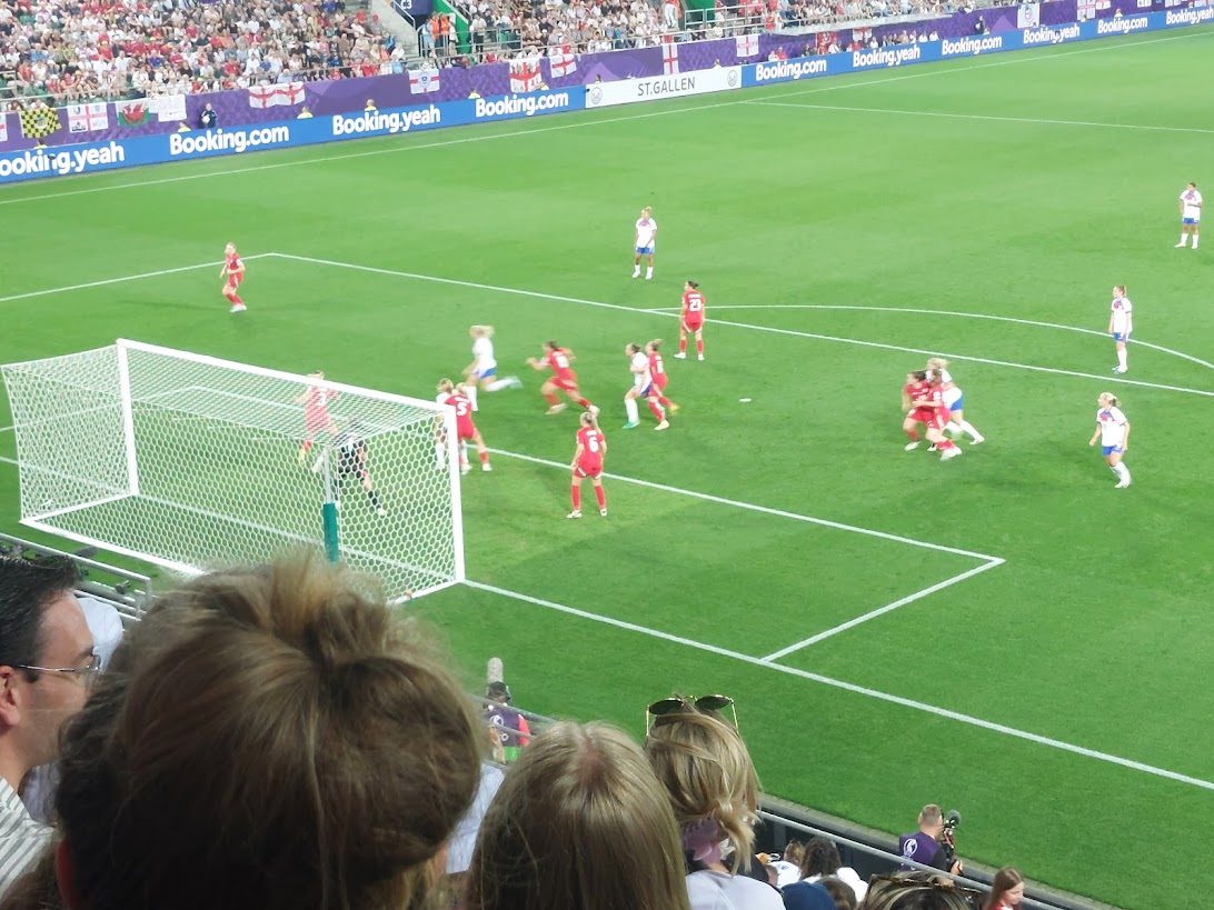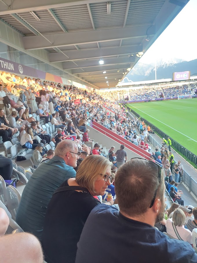 The floodlights do briefly interest me as they lean away from the pitch. That shouldn’t work. There are huge queues everywhere and this is way busier than the previous day’s game. It also reeks of weed, which apparently was legalised in Switzerland a few years back. What’s that stench I ask. Mike replies “that’s Lauren Hemp”.