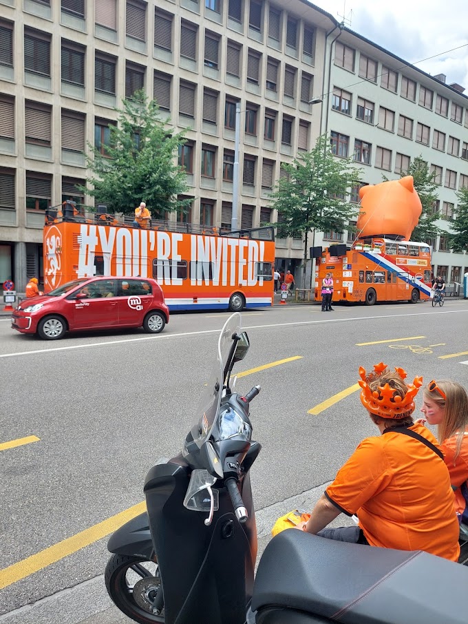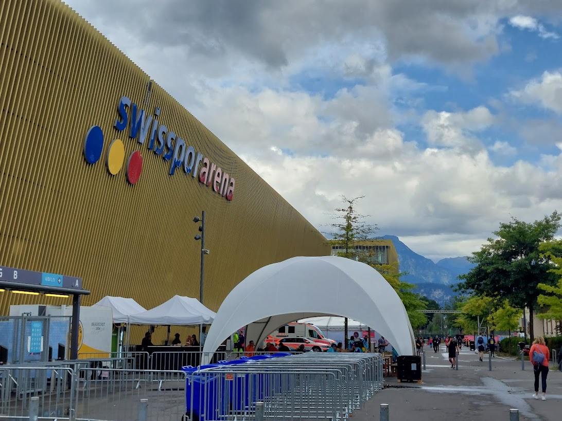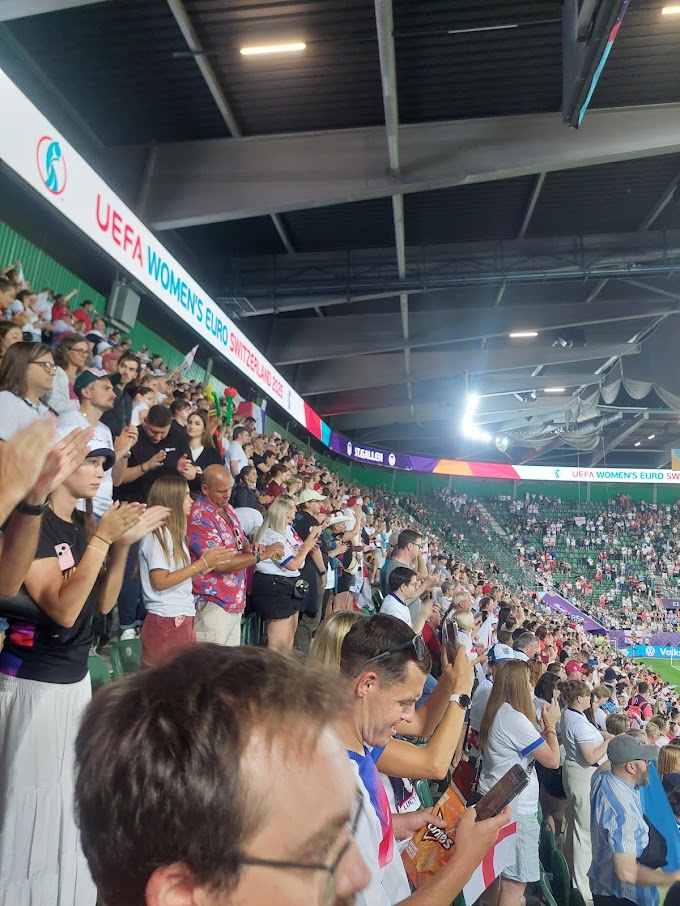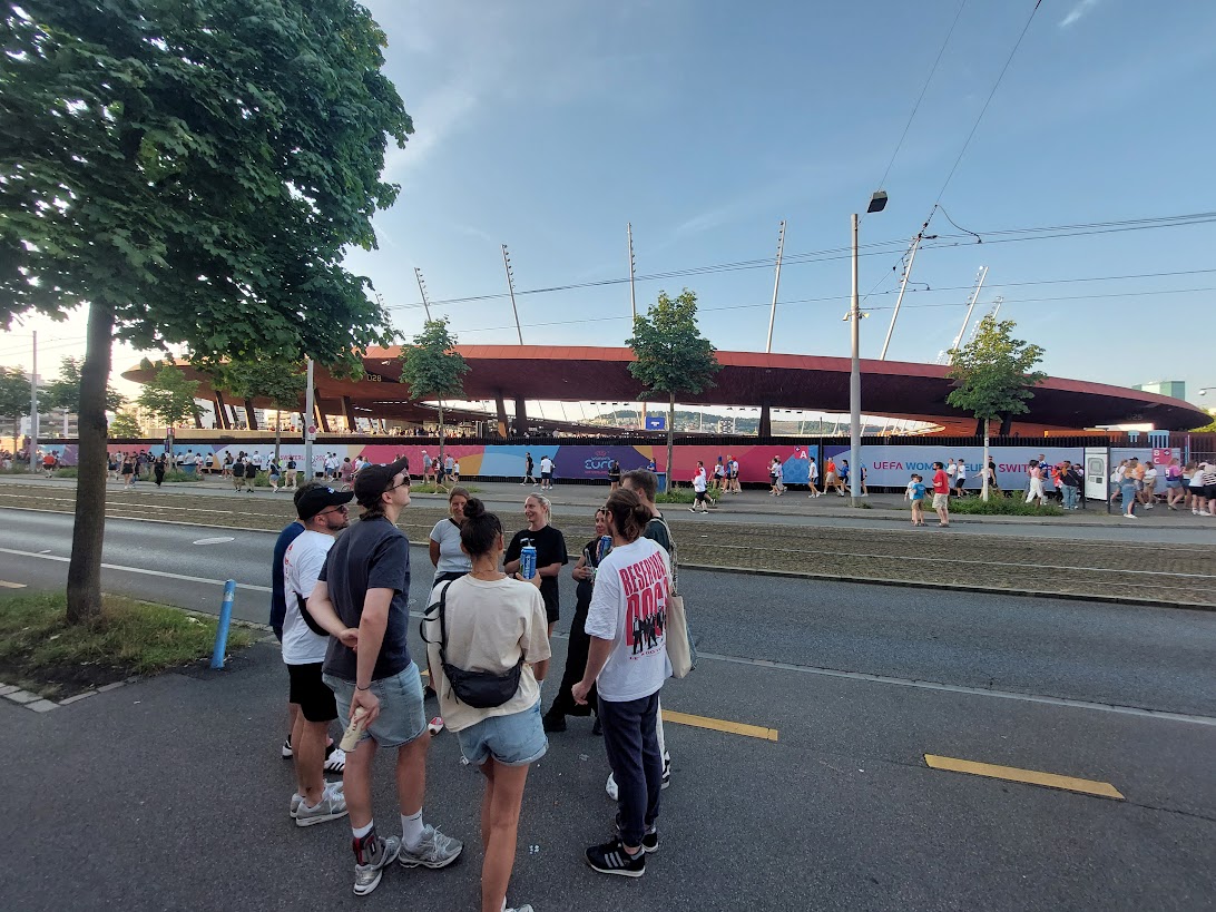 Across from us are a group of England supporters and one has a Lucy Bronze shirt on. We get to talking and they’ve done a lot of England Women’s tournaments. I get the feeling there are a lot of groups like this. A bunch of football loving ladies who follow the Lionesses around. They have a pizza on the luggage rack. I respect it! We have to switch trains in Lausanne and say our goodbyes to the ladies, who are getting on a different part of the new train. “See you on the Jumbotron” says Mike as they depart.