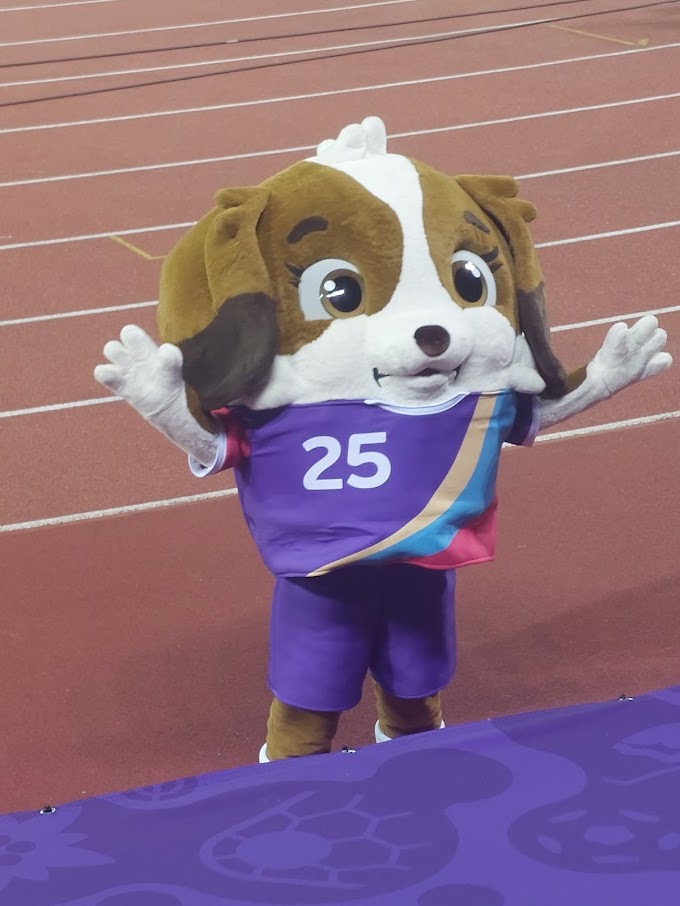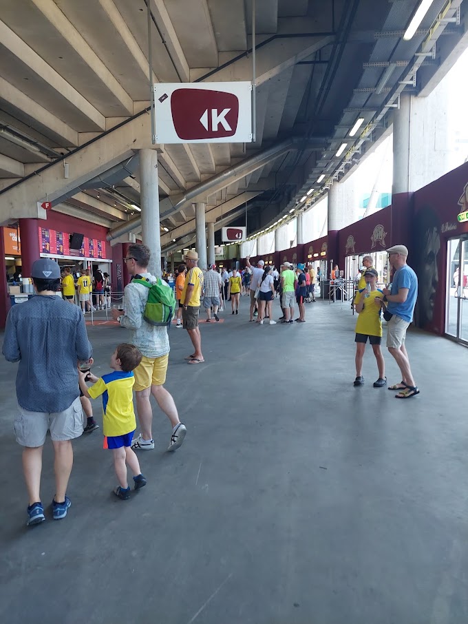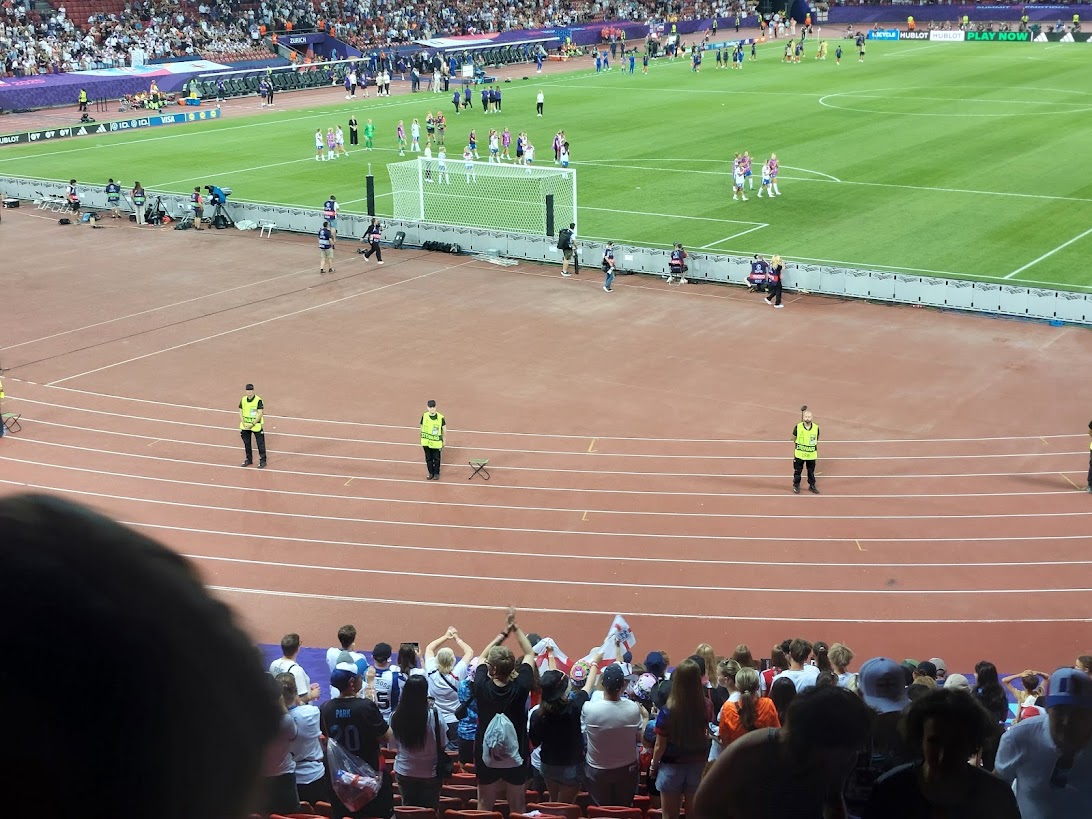 From the concourse at the top (the pitch is sunken below us) I was taken aback at the cool roof that provides shade but leaves space for air to come in too. It’s genuinely a cool ground. However, when we get pitchside…the running track just ruins it. We’re in the second row, confusingly called row 5, and the pitch is miles away. Running tracks are awful in football grounds. I would legitimately love to come and watch athletics here but it’s not a football stadium.