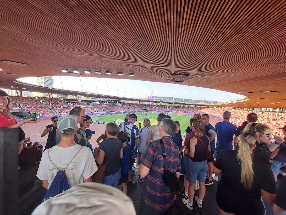 The Danes respond to the tifo with lots of red and white flags. You’ll notice the lack of segregation here. There are Swedes mixed in with the Danes. The friendly atmosphere at women’s games is nothing like the potential powder keg of fiery rivalries with some men’s teams. It’s quite nice, actually. I’m here to relax, not wonder if someone is about to punch me in the back of the head.