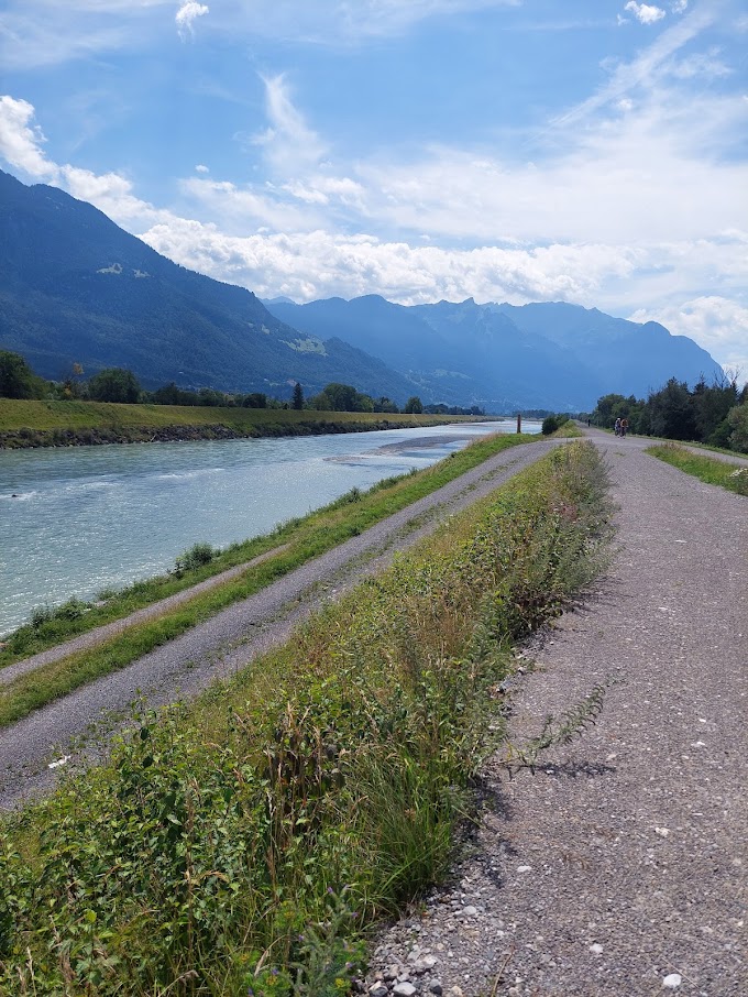 After we get off the train we walk down to the Rhine. The other side of this river is Liechtenstein. We’re walking down to a small foot bridge and crossing over.