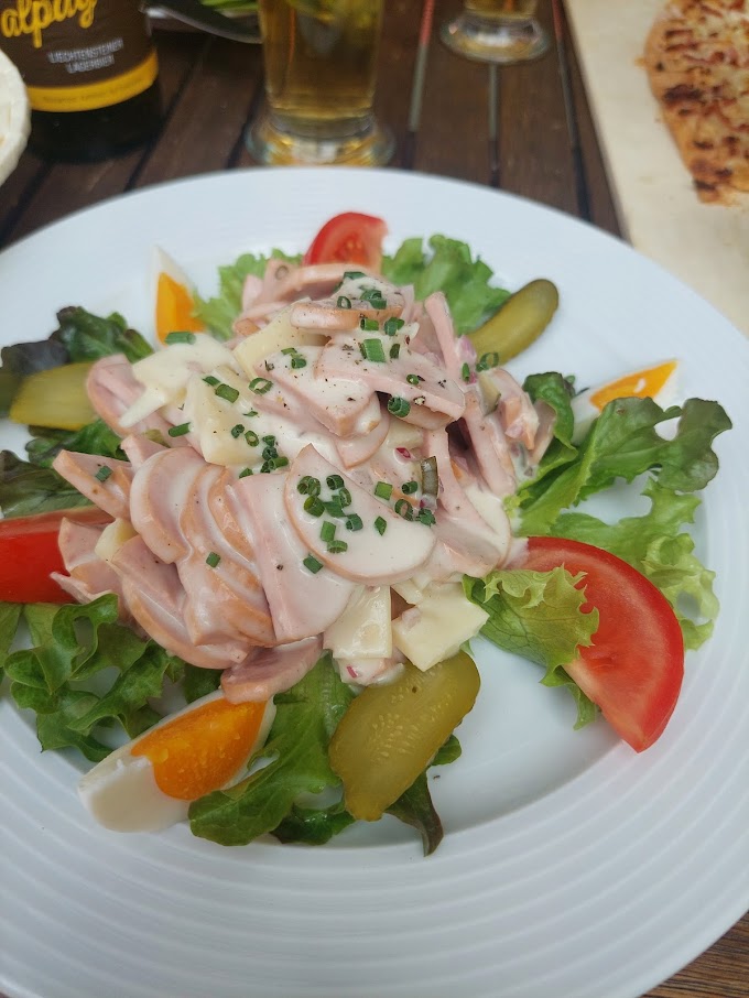 Around an hour after we crossed the border EE welcomed me to Liechtenstein. Thanks lads, doing a bang-up job. We walk about and get some sausage and cheese salad.