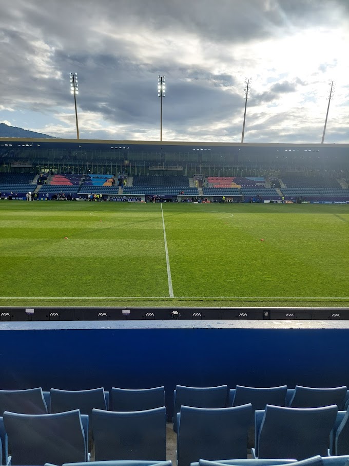 An awful stadium. They shouldn’t play football here. It’s completely unsuitable. The running track is enormous. The added UEFA advertising boards around the pitch meant I couldn’t see if shots were going into the net unless the net itself bulged. Bad line of sight in a stadium with no poles or posts is unacceptable.