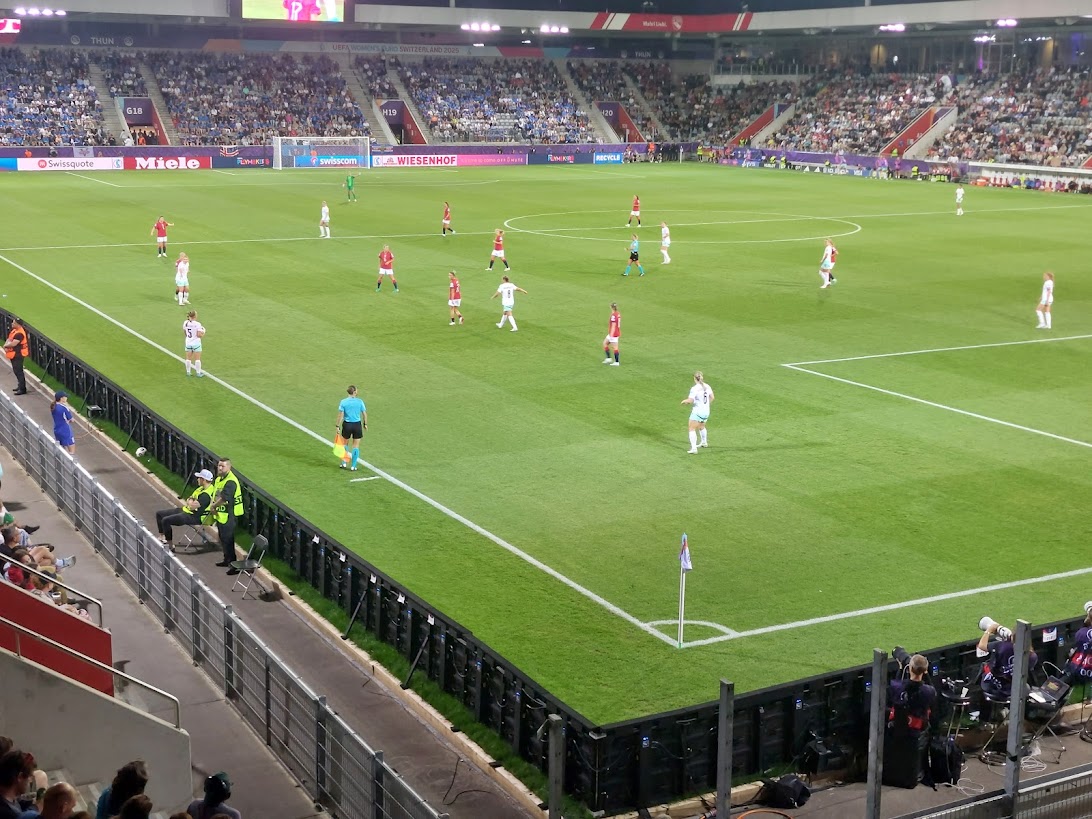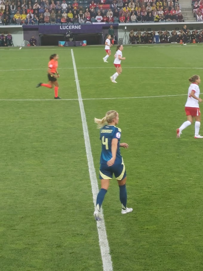 However, this game provided enough thrills and spills for us. First the anthems and a few people don’t bother standing for either anthem. I’m assuming they are Swiss. They are a cold and distant people. Iceland are very loud but Norway has numbers. It should be a good atmosphere. Iceland take it to Norway early doors and when a header from a corner is saved Svendis Jonsdottir opens the scoring. 1-0 Iceland! Jonsdottir is a real ‘one to watch’. Very lively winger who commits players and likes to shoot. A very exciting talent.