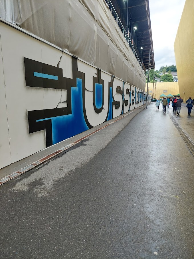On the train there was a girl sat next to Mike, confused by his Luton Town shirt. She started looking up Euro 2025 stuff on her phone and telling her friend about it. The shine in her eyes when she discovered England vs. France was taking place in the “LETZIGRUND” was genuinely lovely. I’m guessing she’s from somewhere near here. From the outside, it looks amazing.