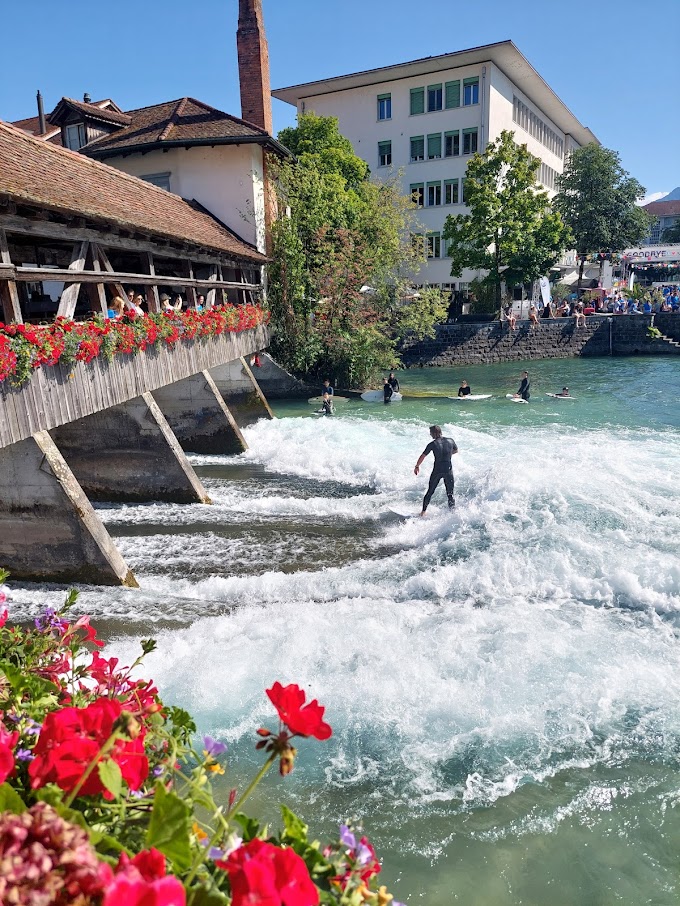 More water-based antics from the Swiss here. A dingy being carried downstream by the current, towing a smaller dingy. And a little speedboat. I saw some lads doing unspeakably dangerous things on the waterways of Switzerland, but it just seems to be normal here. Much like there are no barriers anywhere. People just seem to be better at surviving. Also, everyone looks healthier than in the UK. They have less obesity issues, everyone seems fit and most people cycle. I’m not saying I’m getting sold on the country here but…it’s pretty great.