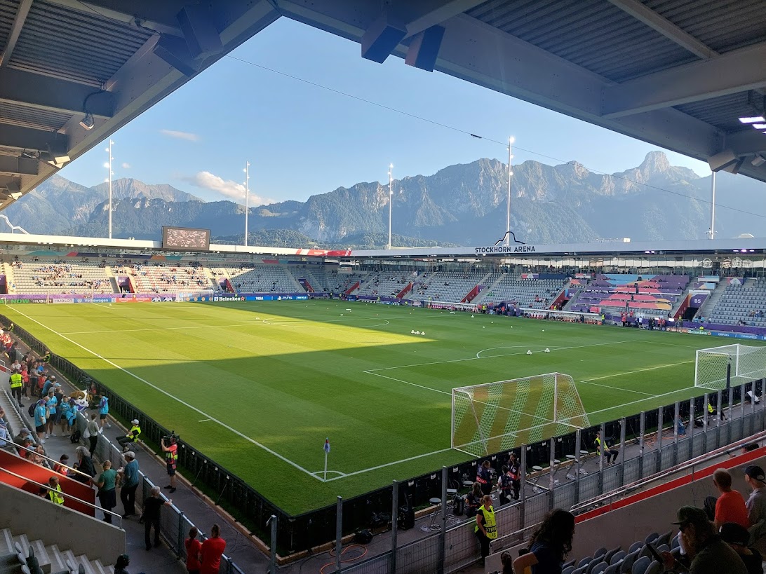 This is the ground for tonight’s game; Stockhorn Arena, dubbed “Arena Thun” by UEFA. Not sure why they can’t cope with the stadium being named after a literal mountain. The mountain is over on the left of the shot. It lines up with the stadium so you can see the mountain through the top of this graphic from the kickoff.