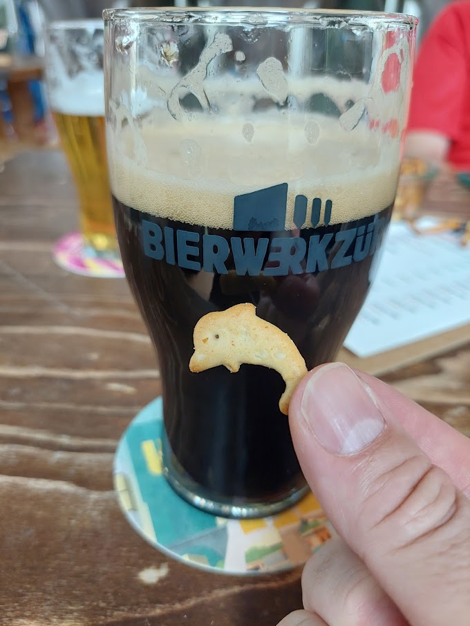 We stroll down to a boozer and find the Dutch fans in good voice. They have this massive bus party thing with an inflatable lion’s head. Mike thinks we may have been heckled as passing English fans. Bierwerk Zuri is the pub. It’s right next to the fanzone and the dreadful Dutch DJ sends us scurrying for inside where you can buy bowls of pretzels that have little dolphins in.