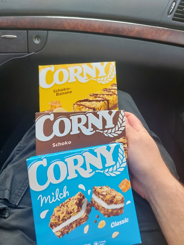 The Big Dohmi has bought me a birthday snack, exploiting my love of the Corny. Schoko-Banane is an excellent flavour and it’s my first time trying the Milch ones and they bang too. The Big Corny never misses. Dohmi is driving us across the country to his family’s favoured holiday destination when he was younger; Vlissingen. It’s way over in Zeelandia and is right on the coast, by the dunes.