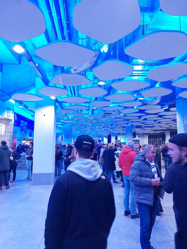 The ground is very modern, seats 20,000 and was opened in 2013. A new ground for a newly successful club. Despite a curved roof, the rain still flows into the seats. The concourse is really good. Aided by pleasing blue lighting. Which, if Amsterdam has taught me anything, it means the place is a haven for transgender prostitutes.