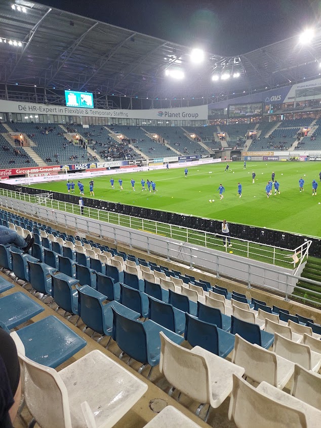 Seating beef aside, it’s a good modern ground and it’s not Gent’s fault that it’s raining. It has a little character and it’s not just a soulless bowl. It was easy enough to get tickets the night before this game, but they came at a stinging 45 Euros. Fucking hell, lads. Still paying for the ground? I would describe our view as optimal though.