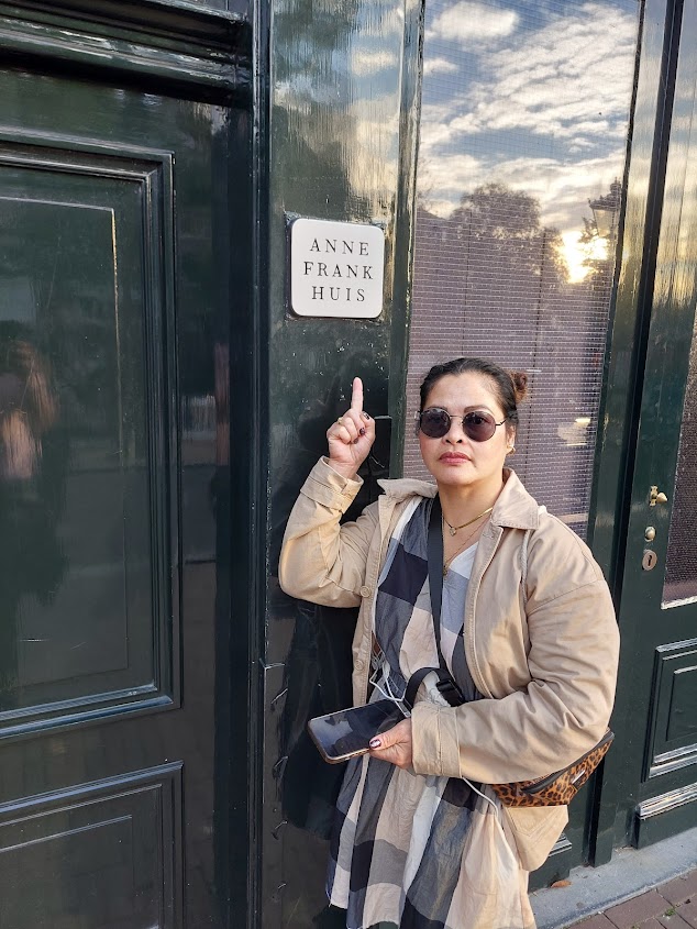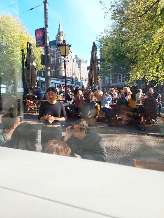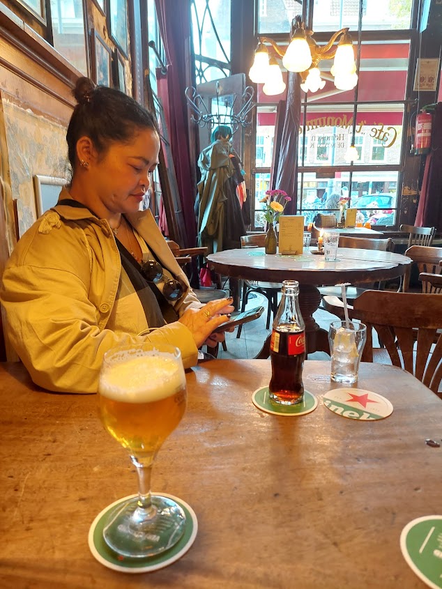 We go to meet Joao in a bar near Anne Frank’s house. I get this snap of Maria outside. I had to tell her to not smile. Being outside the house makes the whole story seem more…real. I’ve not read Diary of a Young Girl, but I might have to now. Anyway, we’re done looking around so we meet Joao, who lives in Eindhoven, for drinks and food and whatnot.