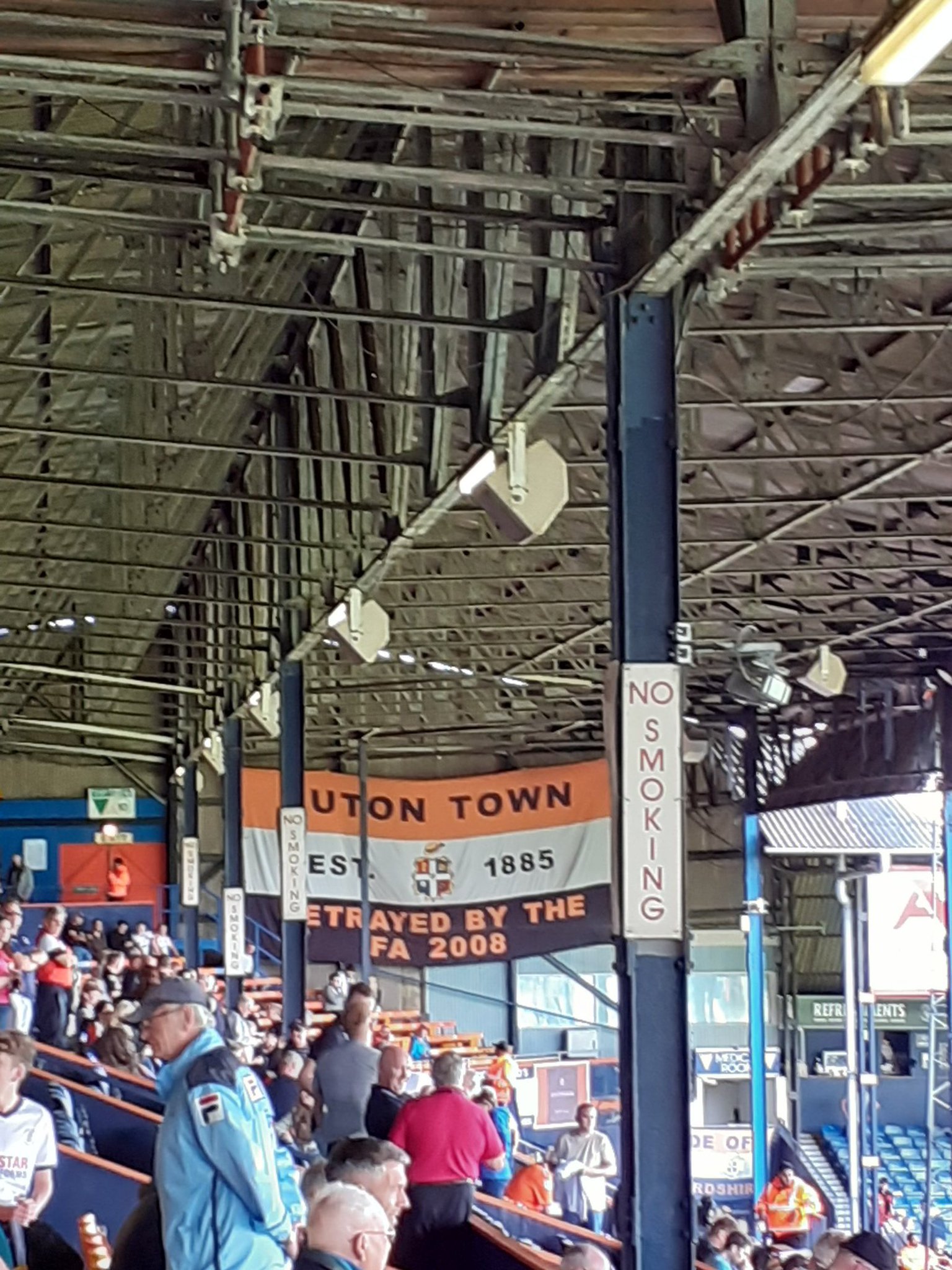 We head on in and inside Kenilworth Road is a bit of a maze. There’s loads of weird staircases and bits that disappear under other bits. It feels like the whole thing has been tacked together and had bits and pieces added for 50 years. I instantly like it. My first sight inside the ground is a massive flag with “Luton Town. Established 1885. Betrayed by the FA 2008” on it. In 2008 Luton had points deducted for “financial irregularities”. They started the season on –30 points. The club is still so hot about it that they allow a massive banner with that incendiary language on it to hang from their stadium and it’s moving to the new one too! Two fingers up to the authorities. Luton are the cool kids here. The FA are basically trash and deserve it.