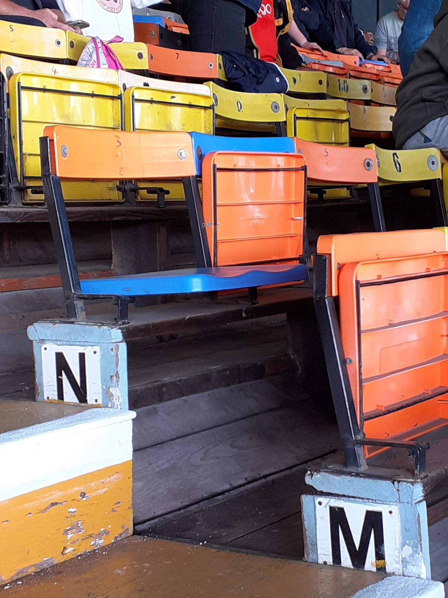 In the main stand we sit. Leg room is…just about ok. I’m glad of having a seat at the end of a row. The entire stand is made up of odd bits of seat. When a seat breaks it gets replaced with whatever they’ve got spare. This creates an insane patchwork of colours. The stand is from Newmarket* and it’s made of wood. It makes me intensely uneasy, sitting in a wooden stand on a hot day. Bradford City 1985 is still fresh in my memory. Apparently, some daft sod set fire to a Welsh flag in the stand when Luton played Cardiff and got beaten up for it. I’m just glad they don’t allow smoking in there. The peculiarities don’t even end here. You need a ladder to get to the vertigo inducing press gantry and everywhere I look are weird shaped areas of the ground that don’t look right.