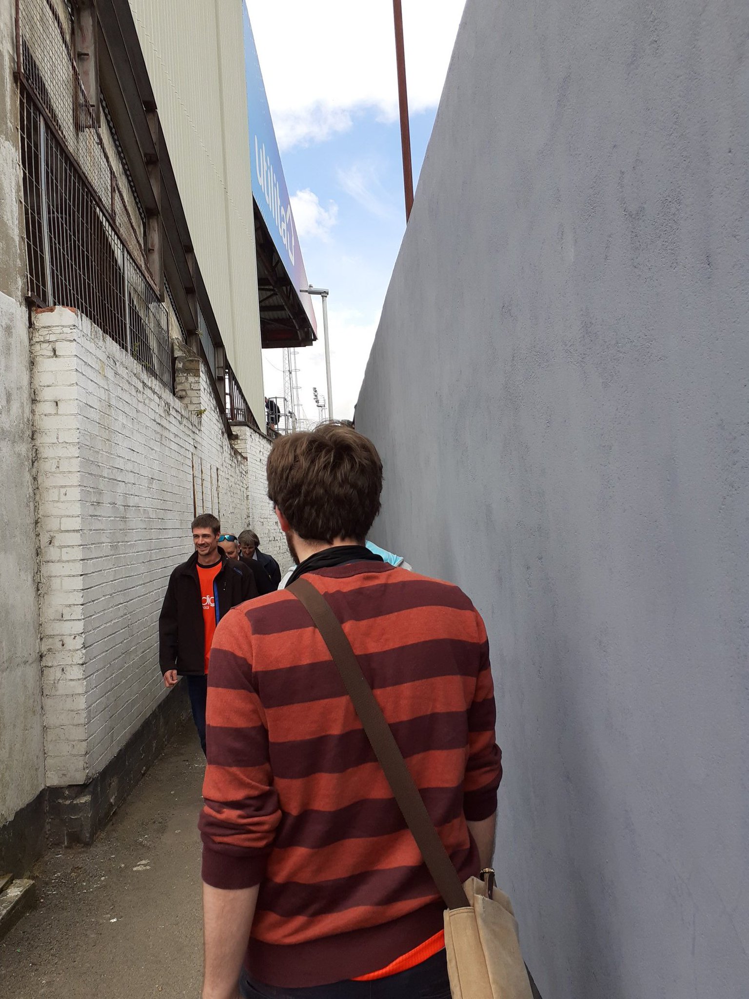 To the right of the stadium is an alleyway, which apparently usually has a mattress in it. Someone has removed it. There’s still dogshit though so Covid hasn’t changed everything. The alleyway is littered with graffiti. The random “Sally Pablo’s” is odd. Barney tells me one of the toilets had graffiti on it for years reading “Richard Money sodimises dogs”.