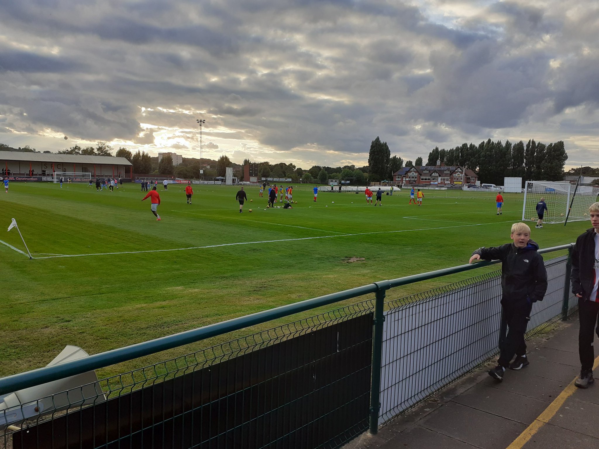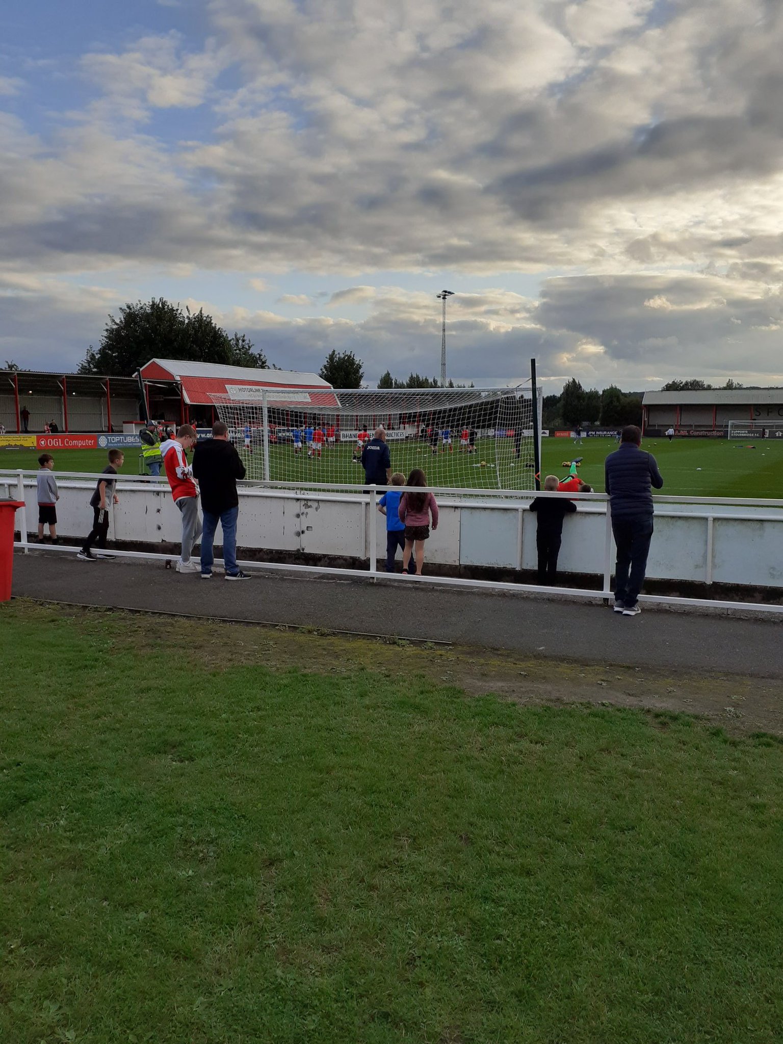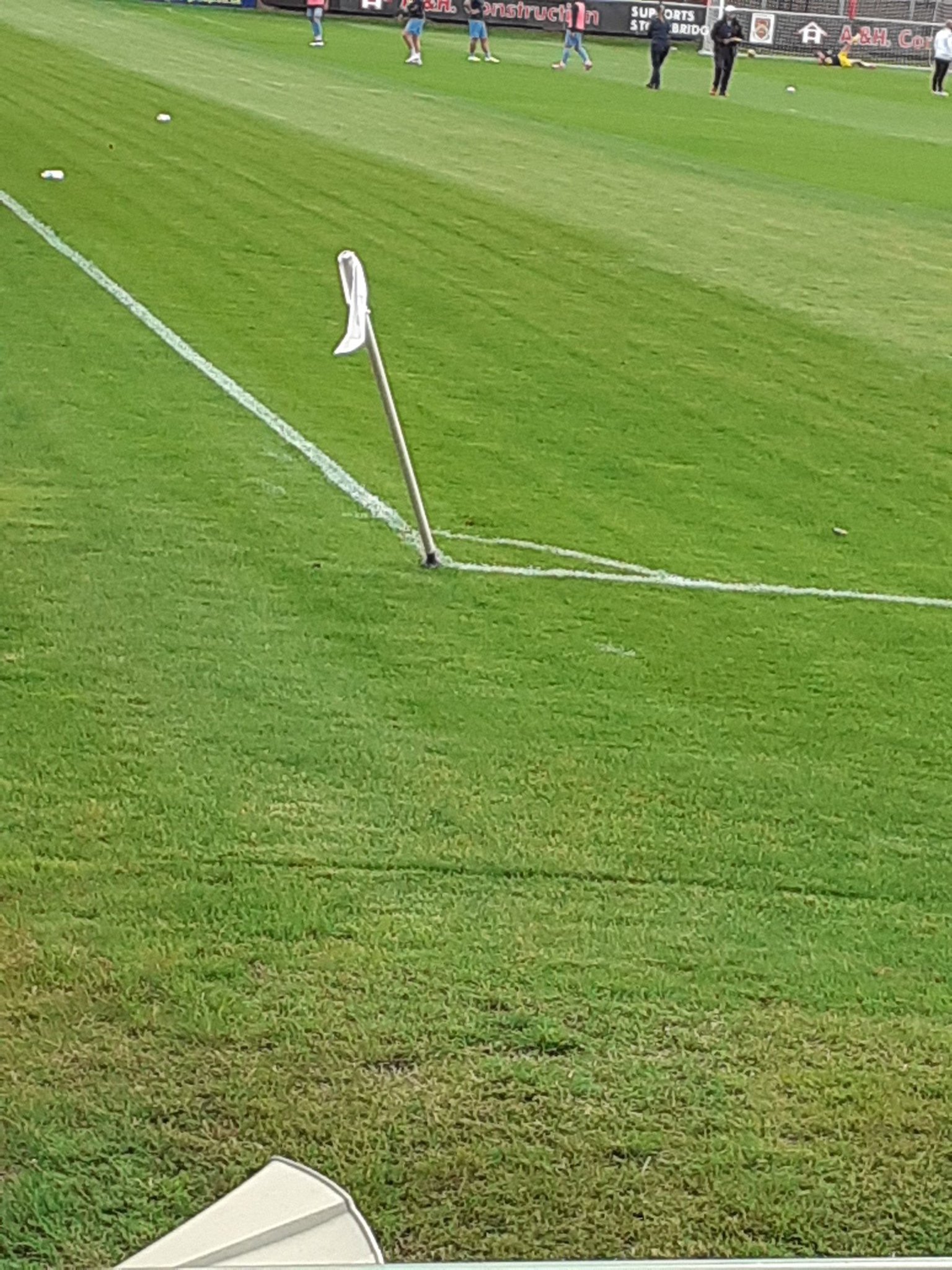 We start out (above) stood behind the goal during the warm ups but quickly move after nearly being struck by a ball. Stourbridge’s shooting leaves a lot to be desired. We end up moving to (below) stood in the corner where there are barriers to put your drinks on. It’s the best part of the ground in my opinion. I go on to think of it as “Grumbler’s Corner”.